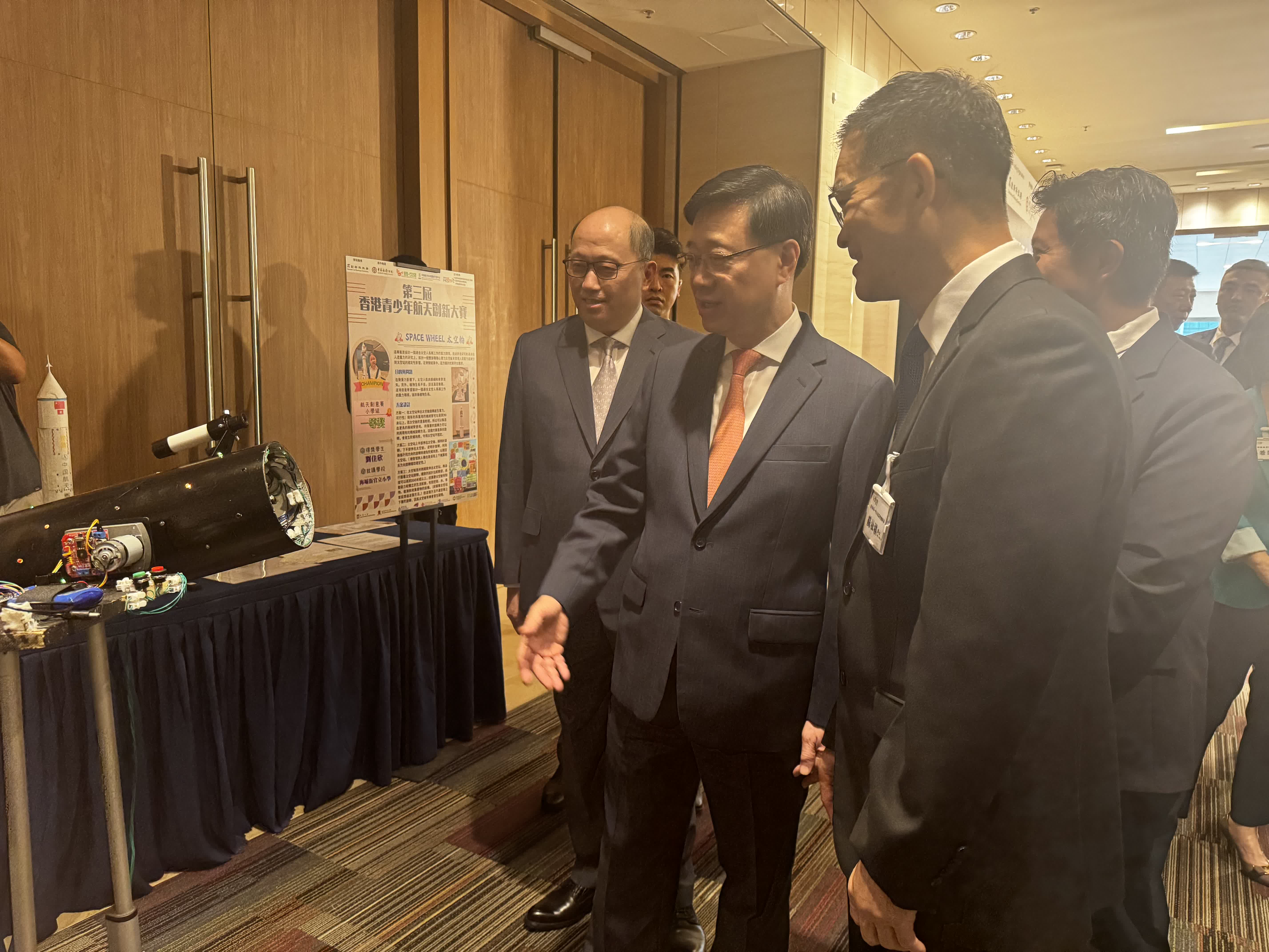 李家超和鄭雁雄於開場前欣賞航天創新大賽的獲獎作品。李家超發出感慨,自己成長的時代並沒有這樣的時挑戰機會,現在國家為年輕人安排了很多創新類、航空類的活動。鄭雁雄當得知獲獎作品是創作者均為中小學生時,不禁感歎,「有志不在年高,後生可畏,為你們點讚!鼓勵大家追風趕月莫停留,平蕪盡處是春山」。