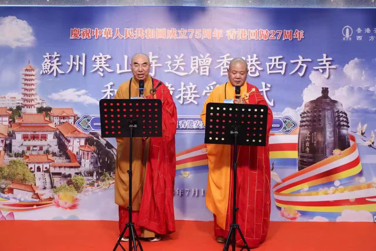 今年欣逢中華人民共和國成立75周年、香港回歸27周年。為進一步弘揚中華傳統文化,推動香港與國內佛教文化間的友好交流,共同促進香港與蘇州佛教文化發展,蘇州寒山寺秋爽大和尚特向西方寺贈送一口仿唐鑄銅「和合鐘」。法誼深厚,意義重大。