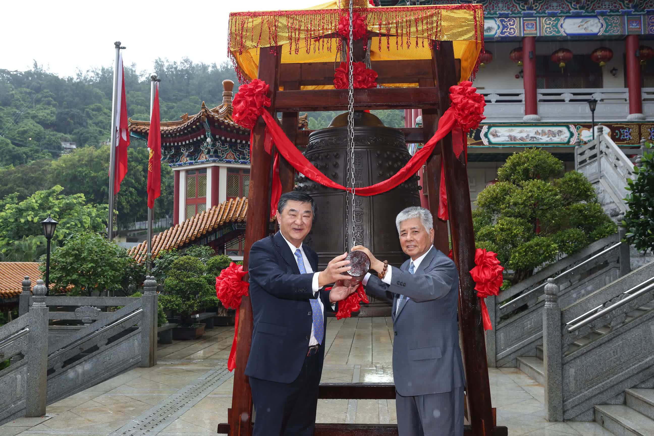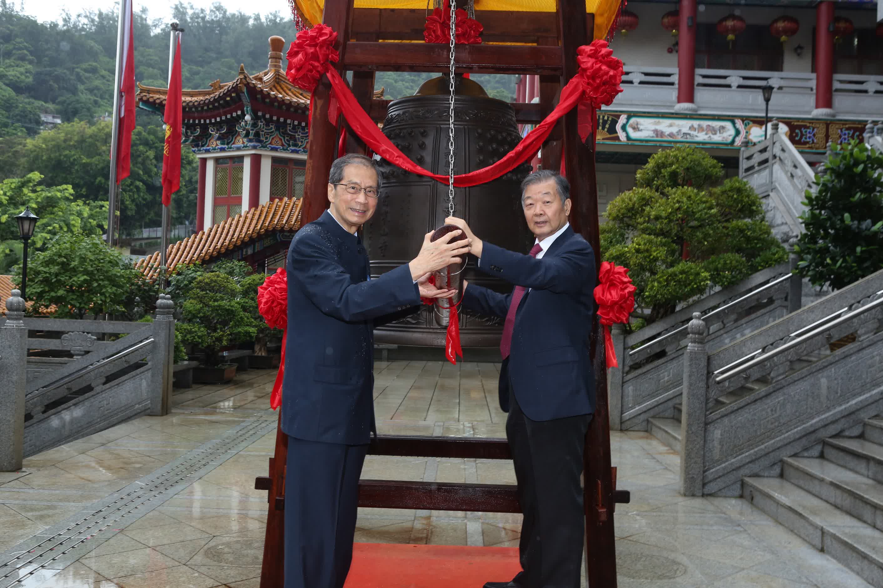 江蘇省佛教協會會長、蘇州寒山寺方丈秋爽大和尚發表致辭。秋爽大和尚說,「洪鐘長聲覺群生,走遍十方無量土;寒山鐘聲揚好風,傳遍香江西方寺;鐘聲響徹三千界,消除煩惱增智慧;祈願世界皆和平,香港明天更美好」。「聞鐘聲煩惱輕,智慧長菩提生,離地獄出火坑,願成佛度眾生。」在諸多佛門法器中,鐘聲發揮着不同尋常的作用。它震動了人的耳根,震動了人的心靈,開啟人天耳目;它徹響天地,超拔救度惡趣罪苦眾生。在此娑婆世界中,常以音聲作佛事,叢林法器中,又以大鐘為第一。