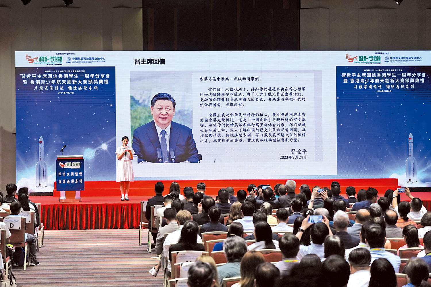 (大公報記者 吳俊宏)習近平主席回信香港學生一周年分享會暨香港青少年航天創新大賽頒獎典禮昨日在香港科學園舉行。香港特區行政長官李家超、中央政府駐港聯絡辦主任鄭雁雄出席並致辭。中央政府駐港聯絡辦副主任盧新寧,特區政府有關部門官員,香港主要教育社團、青年團體負責人,參賽和獲獎師生等400多人出席活動。