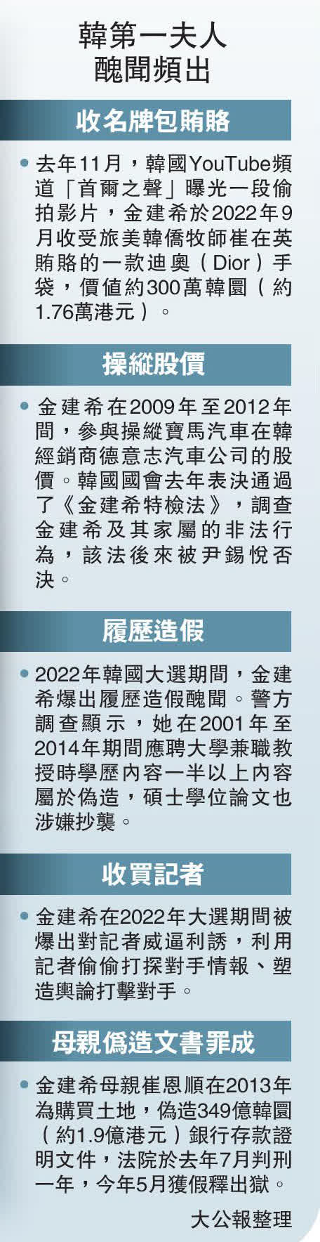 從2022年韓國大選以來,金建希的爭議不斷,先是被踢爆履歷造假、威脅記者,收受名牌手袋一事遭曝光後,引發軒然大波。韓國國會於去年12月底表決通過了《金建希特檢法》,調查金建希及其家屬的非法行為,但該法被尹錫悅否決。連串醜聞打擊尹錫悅本已低迷的支持率,導致其政黨在4月的國會選舉中慘敗,未能贏得大多數席位。