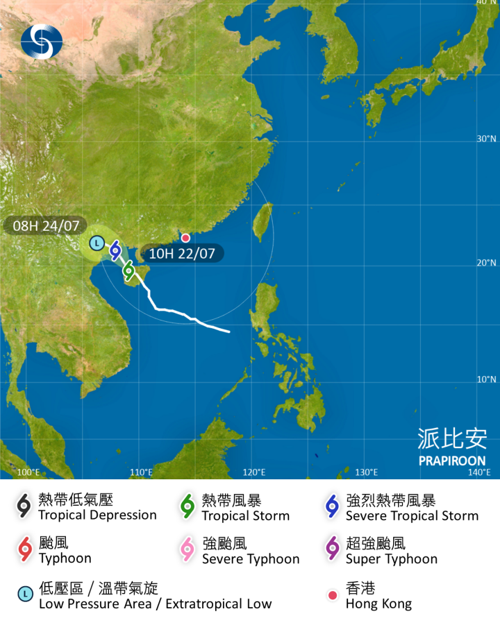 在上午10時,熱帶風暴「派比安」集結在香港之西南偏西約610公里,即在北緯19.6度,東經109.1度附近,預料向西北移動,時速約14公里,進入及橫過北部灣。天文台提醒,海面有湧浪,市民請遠離岸邊及停止所有水上活動,並留意最新天氣消息。