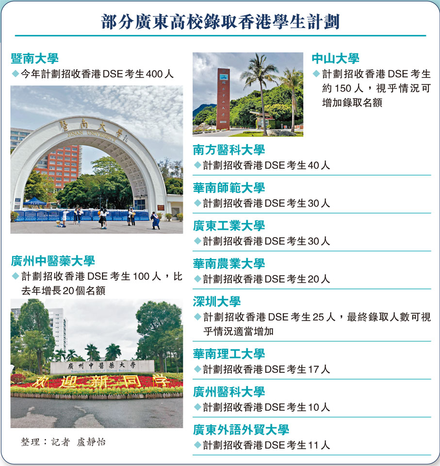 (香港文匯報記者 盧靜怡 廣州報道)繼香港DSE放榜後,「內地高校招收文憑考試學生計劃」在7月下旬公布錄取結果。港生北上求學持續升溫,加上今年內地增加6所高校招收香港文憑試考生,為香港學子增加更多求學選擇。廣東高校本月底陸續開始錄取DSE考生。暨南大學、廣州中醫藥大學等高校招生負責人接受香港文匯報專訪時表示,隨着報考人數增長,不少高校今年招收港生人數比往年有所增加,建議學生選擇專業時多考慮個人興趣和特長,避免盲目跟風。有應屆港生受訪時表示,選擇報考廣東高校,是被粵港澳大灣區的「一小時生活圈」所吸引,同時對廣東高校不斷提升的教育水平和豐富的學科選擇充滿信心,看好畢業後的發展前景。