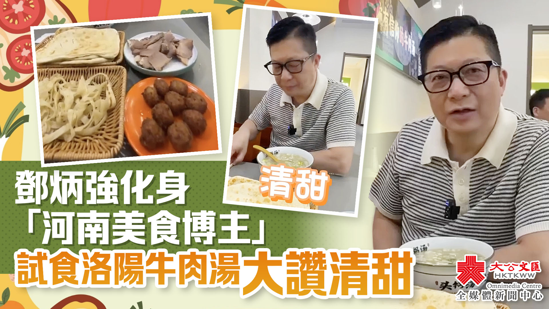 大公文匯全媒體報道,正帶領青年領袖在河南進行考察的保安局局長鄧炳強,繼續化身「美食博主」。昨日在鄭州試過正宗胡辣湯後,鄧炳強今日(22日)又在社交網站上載短片,大啖洛陽牛肉湯及薄餅,又試飲當地特色汽水「海碧」。