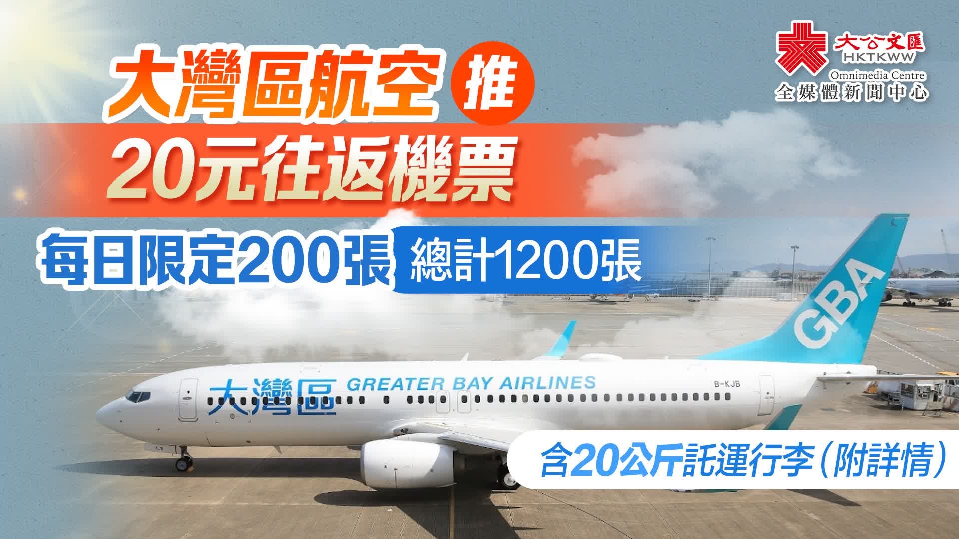 大公文匯全媒體報道,大灣區航空今日(22日)公布,為慶祝啟航兩周年,明天(23日)起至25日,以及29至31日的6天內,只需追蹤其社交媒體賬戶(Facebook及Instagram),並留意當天早上10時公布的優惠航點及優惠碼(中午約12時公布),即可於官網輸入優惠碼,以港幣20元購買來回機票。(搶飛連結)