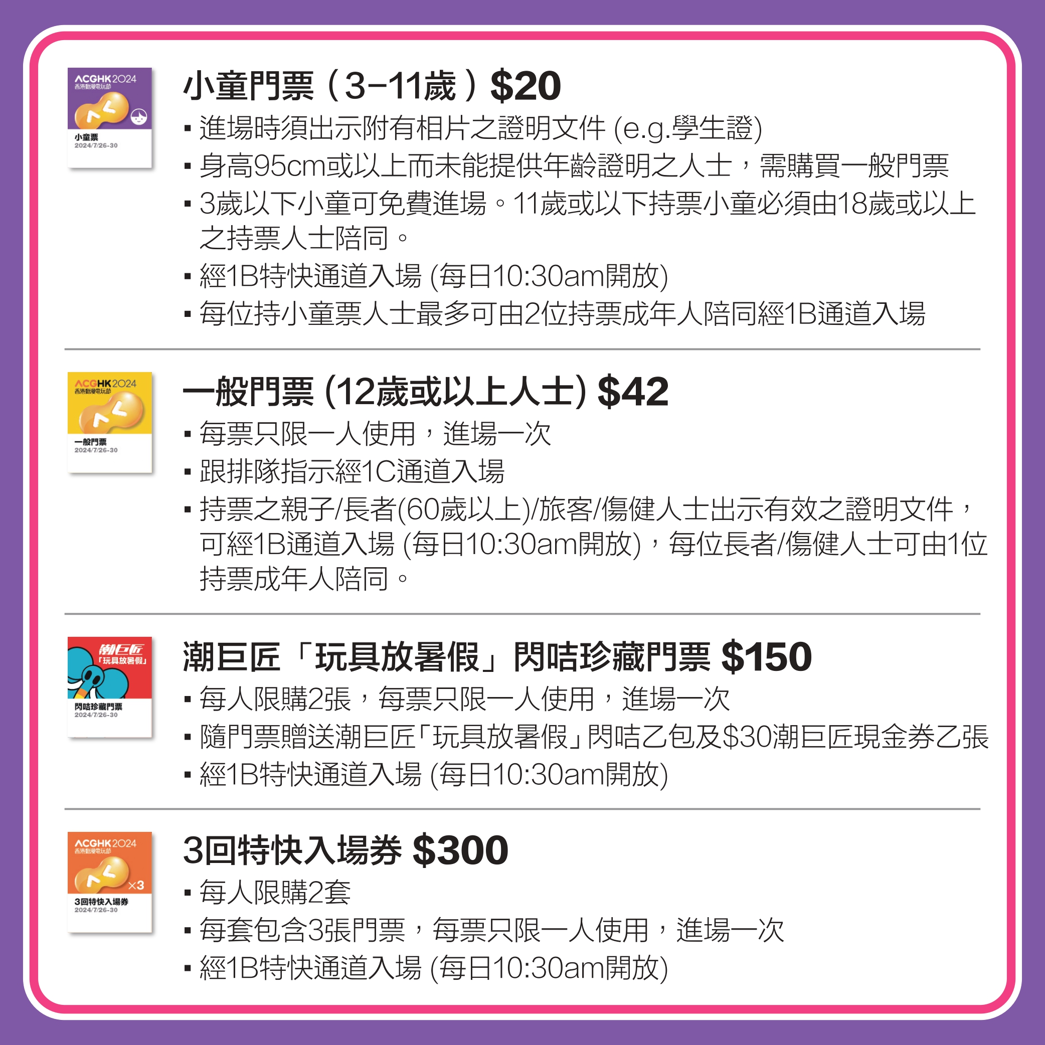 ♢ 門票售價:20港元(小童門票)/42港元(一般門票)/150港元(潮巨匠「玩具放暑假」閃咭珍藏門票)/300港元(3回特快入場券)