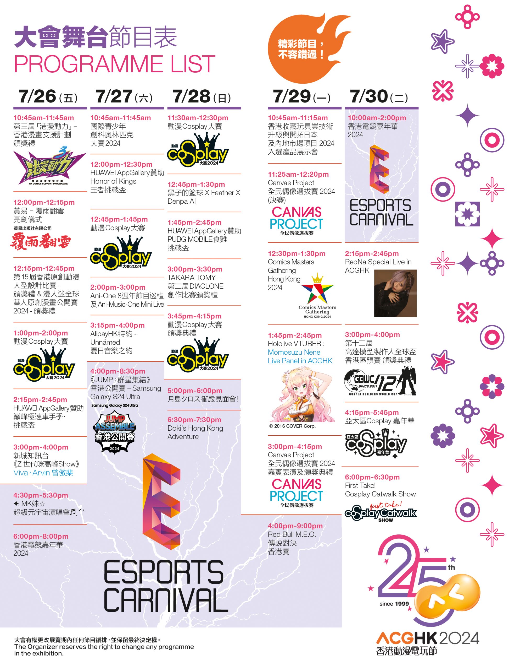 今次展覽推出眾多節目同活動。值得關注的是,本次動漫節大會主舞台邀請到Sony Music旗下動畫歌label SACRA MUSIC的女歌手「ReoNa」舉行ReoNa Special Live in ACGHK!她亦是《刀劍神域外傳 Gun Gale Online》中角色「神崎艾莎」的聲優!此外,hololive的Vtuber桃鈴ねね也將現身主舞台擔任嘉賓,與粉絲見面!