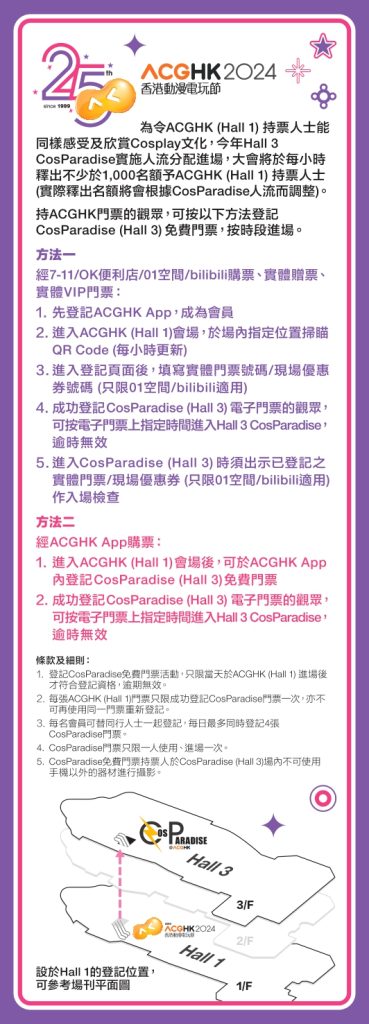 為了讓ACGHK(Hall 1)持票人士都能夠上Hall 3看Cosplay,展會將於每小時釋出不少於1000名額給ACGHK(Hall 1)持票人士(#實際釋出名額將根據當時人流而有所增減),屆時將需要以ACGHK app作即時網上登記免費門票,之後按照時段進場。