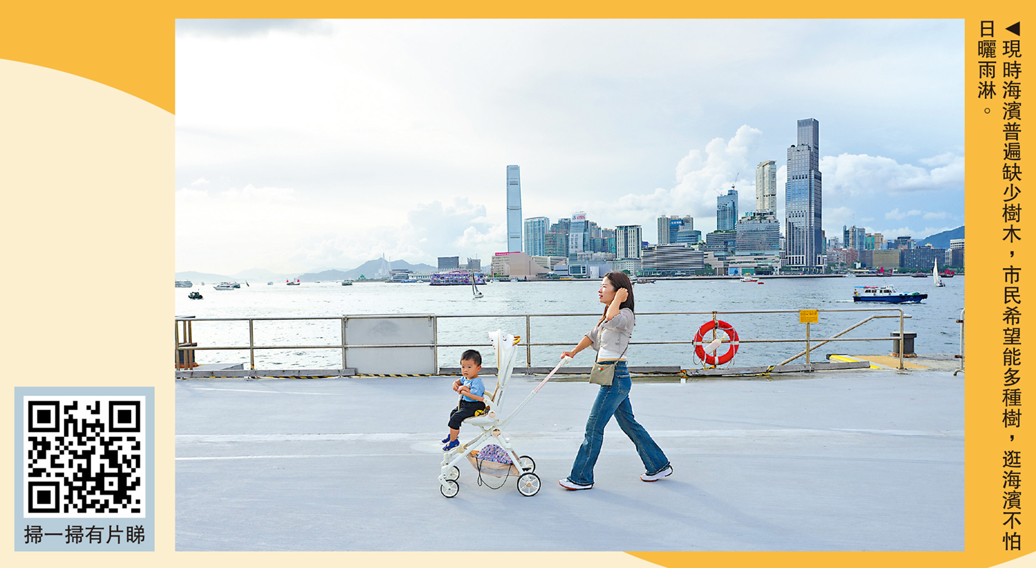 「極端天氣影響愈來愈明顯,尤其今年夏天,熱得好犀利,又會突然下暴雨,大家逛海濱時都會覺得,我們需要種多些樹,為市民遮蔭擋雨。」何文堯說,海濱事務委員會過去並非不種樹,海濱也有綠化,但第一優先是「先駁通」,爭取盡快開放更多海濱路段;樹木不便宜,也是原因之一。