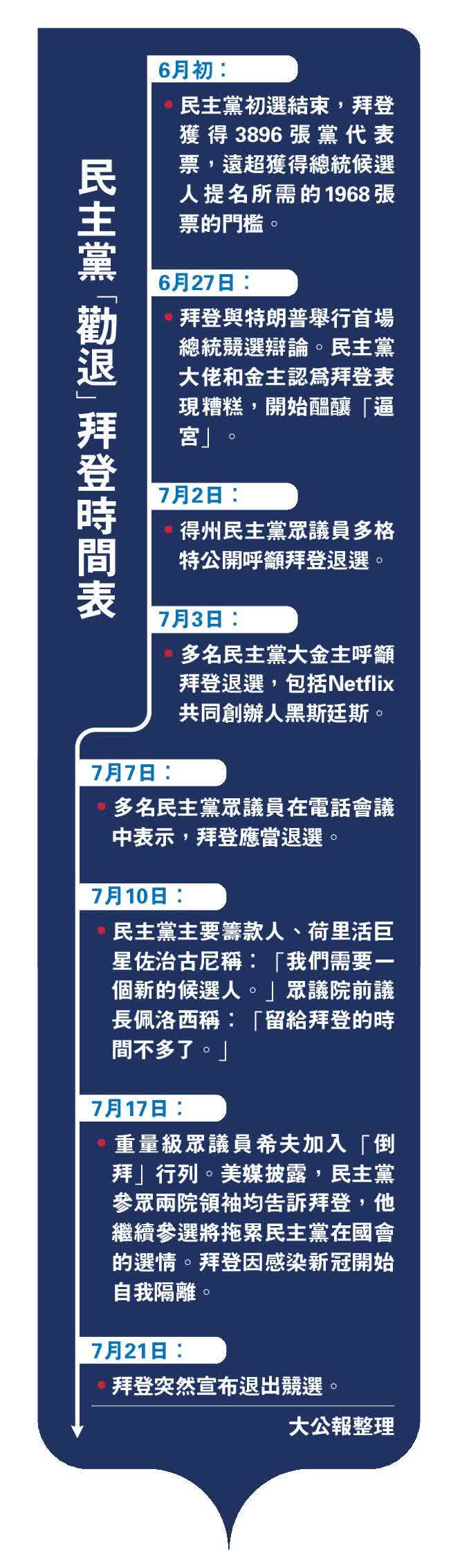 大公報綜合CNN、《華盛頓郵報》、《華爾街日報》報道,美國總統拜登21日突然通過社交媒體宣布退出2024年總統競選。分析人士指出,拜登是在民主黨內高層施壓和大金主威脅跳船的情況下「被迫」退選,暴露美國政治黨派利益至上、金錢驅動選舉的亂象和本質。共和黨藉機對民主黨展開猛烈攻擊。眾議院議長約翰遜稱,超過1400萬美國選民在民主黨初選中投票給拜登,民主黨如今逼迫拜登退選,證明該黨其實與「民主」背道而馳。