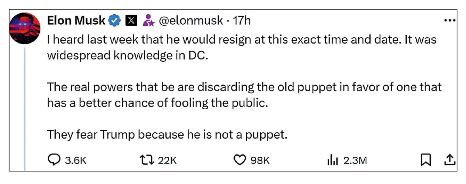 馬斯克還發文稱,他早在上周便得知拜登宣布退選的具體時間,「這在華盛頓廣為人知」。他聲稱:「真正的掌權者正在拋棄這個老傀儡(拜登),轉而支持另一個更有可能愚弄公眾的傀儡(哈里斯)。他們害怕特朗普,因為特朗普不是傀儡。」他在一些民主黨人士的帖文下為共和黨拉票,並表示:「我最聰明的那些朋友,包括那些住在舊金山灣區、一輩子都是民主黨的人,都對特朗普和萬斯的競選組合感到興奮。」