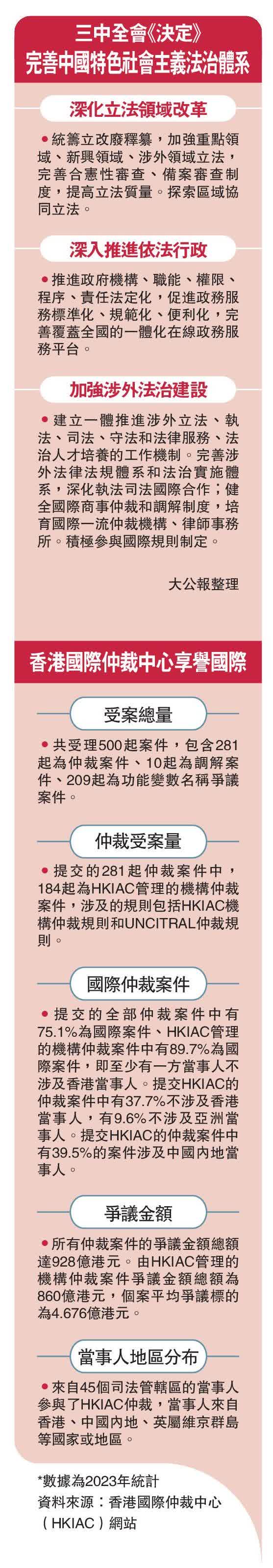 「把加強涉外法治建設納入三中全會公報重要組成部分,本身就意味着這項工作在國家總體戰略部署中地位的提升。從相關表述來看,是更加全面具體地部署工作,同時總結過往涉外法治建設過程中的重點問題和突出問題,公報內容是帶有很強針對性的改革思路、方向和舉措。」資深涉外法治專家、廣東廣信君達律師事務所管委會主任閃濤向大公報表示,《決定》特別提及健全國際商事仲裁和調解制度,培育國際一流仲裁機構、律師事務所,意味着中國將加大法治建設國際話語權,着重培養涉外法治人才。