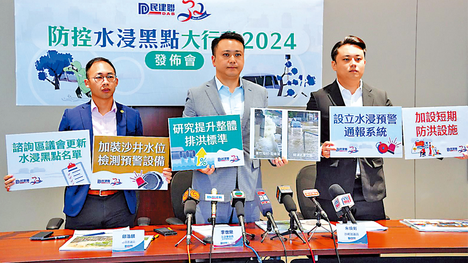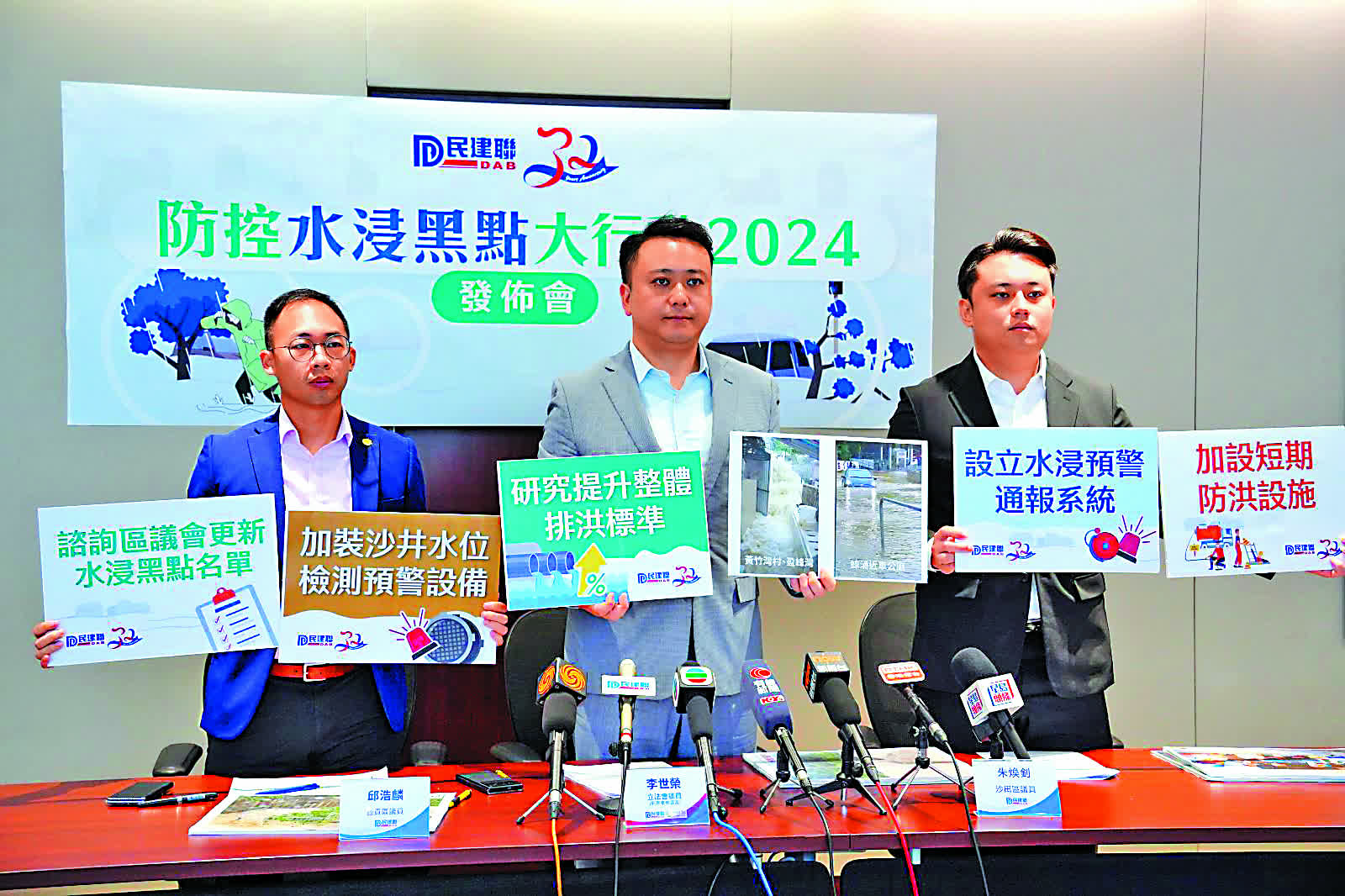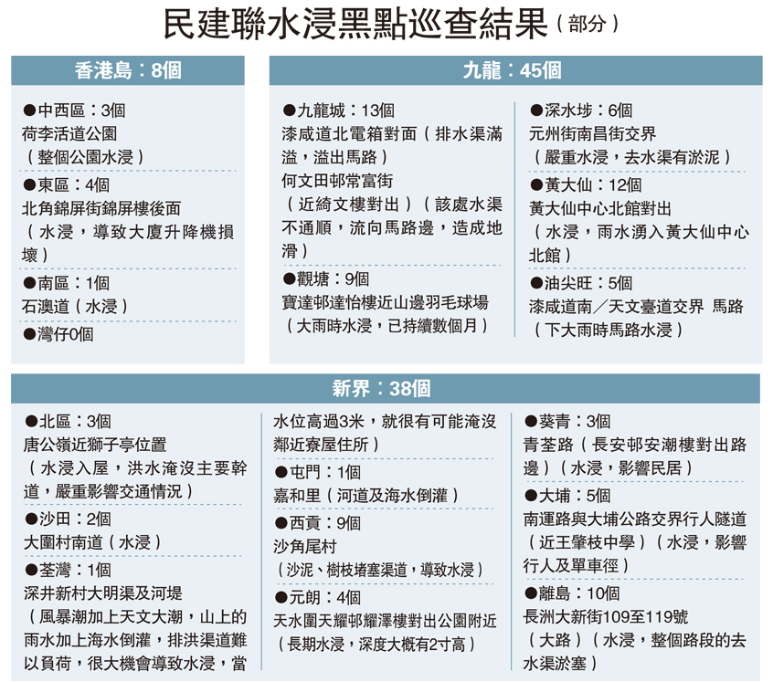 民建聯昨召開記者會公布各區水浸黑點調查情況。立法會議員李世榮表示,91個水浸黑點是由區議員及地區幹事實地搜集得出,被列為黑點的地方主要是出現雨水超過排水系統負荷、河道及海水倒灌、雨水湧入商戶或屋苑,以及沙泥樹枝堵塞渠道引致雨水積聚地面等情況。水浸黑點主要集中在九龍區,共有45個,新界區有38個,港島區則有8個。