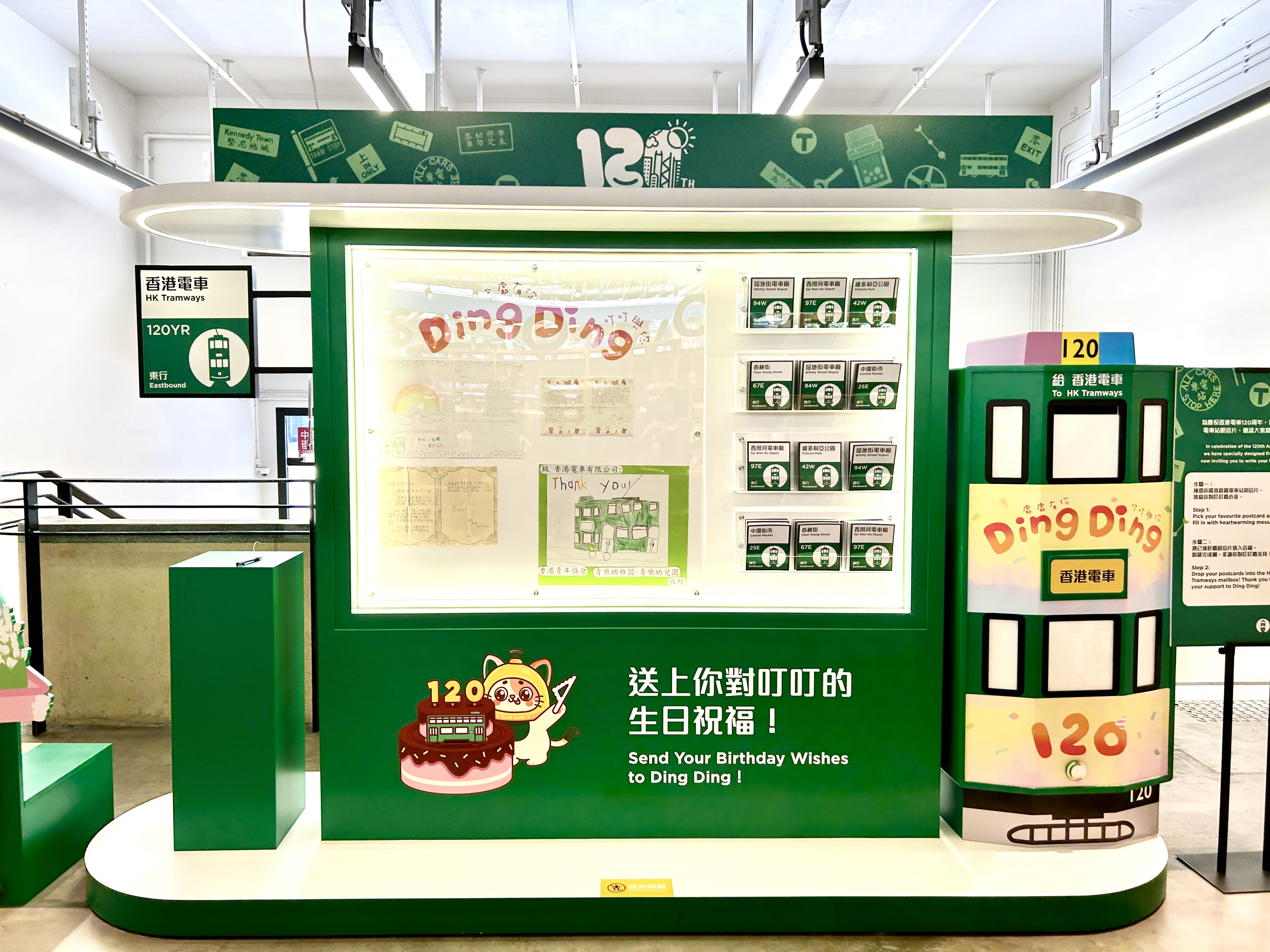 在二樓打卡點設有電車明信片站,想送上生日祝福的市民可以將明信片投遞至郵箱,工作人員將會選取部分信件展示。除了寫生日祝福,二樓同樣可以享受香港美食,香港電車邀來「媽咪雞蛋仔」及「Chart Coffee」合作,推出雞蛋仔、「Don't 0T」凍檸啡雪葩特調、奶醬多凍咖啡及帶有電車圖樣的熱鮮奶等系列美食。
