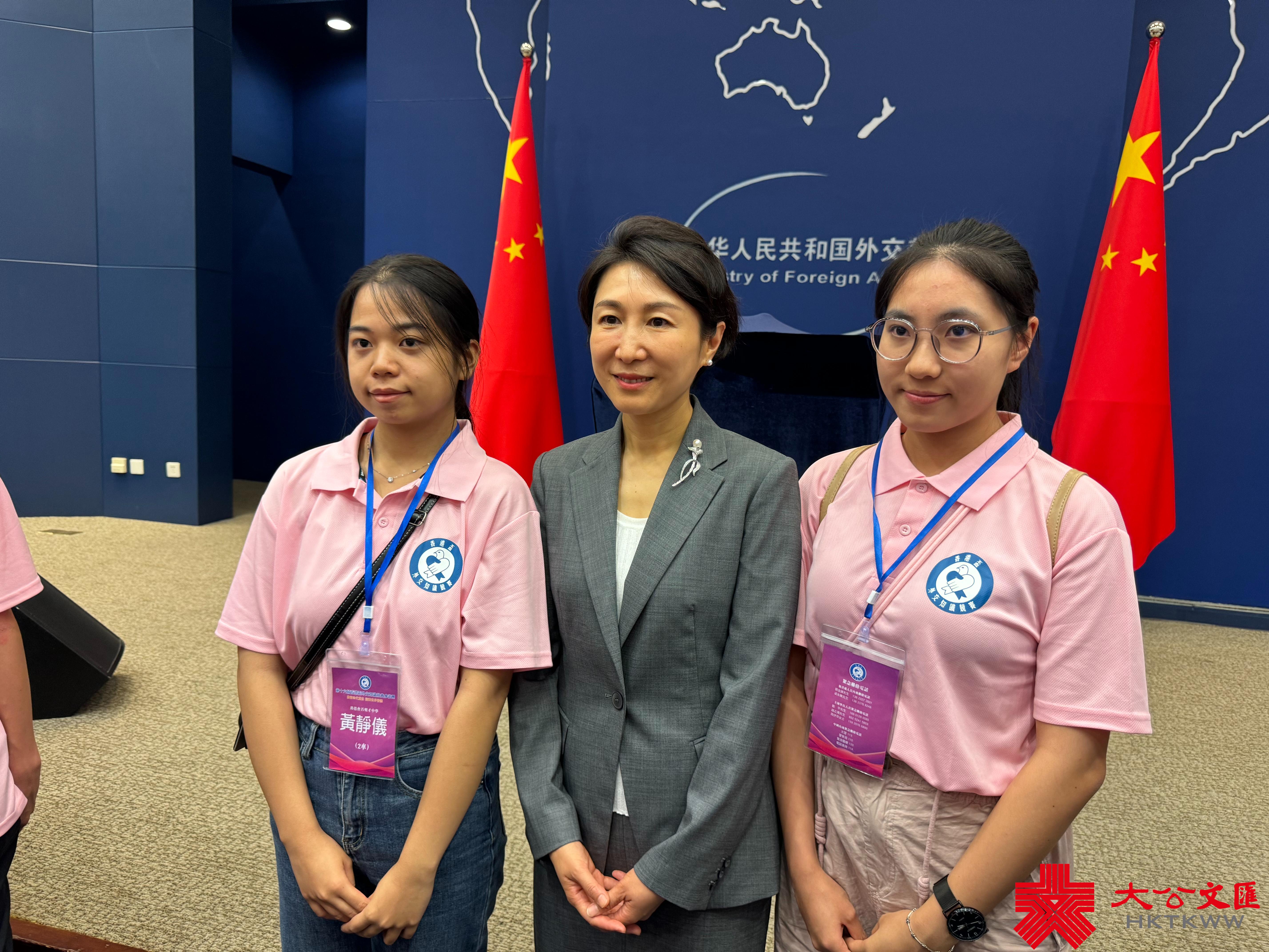 (大公文匯網記者 馬靜 北京報道)第十六屆香港盃外交知識競賽參訪團日前走進外交部,在外交部新聞發布廳「藍廳」,同學們旁聽外交部例行記者會,並與外交部發言人毛寧交流互動。對同學們提出的每一個問題,毛寧都有問必答,坦誠交流,她鼓勵有志從事外交事業的同學現時好好學習,做好知識儲備,將來可以為國家外交作出貢獻。