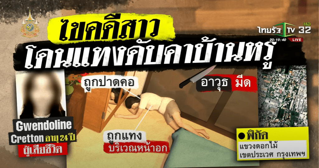 警方其後接獲報案,經初步調查判斷為一宗謀殺案,並將Gwendoline的男友Wai拘捕。據悉,泰國警方發現Gwendoline身中9刀傷重不治,其中喉嚨被割斷,胸部亦有刀傷,死狀恐怖。Wai接受盤問時堅稱女友是自殺身亡,但經警方現場勘查和翻查閉路電視片段後,認為Gwendoline是在家中遭到殺害及抬離單位。