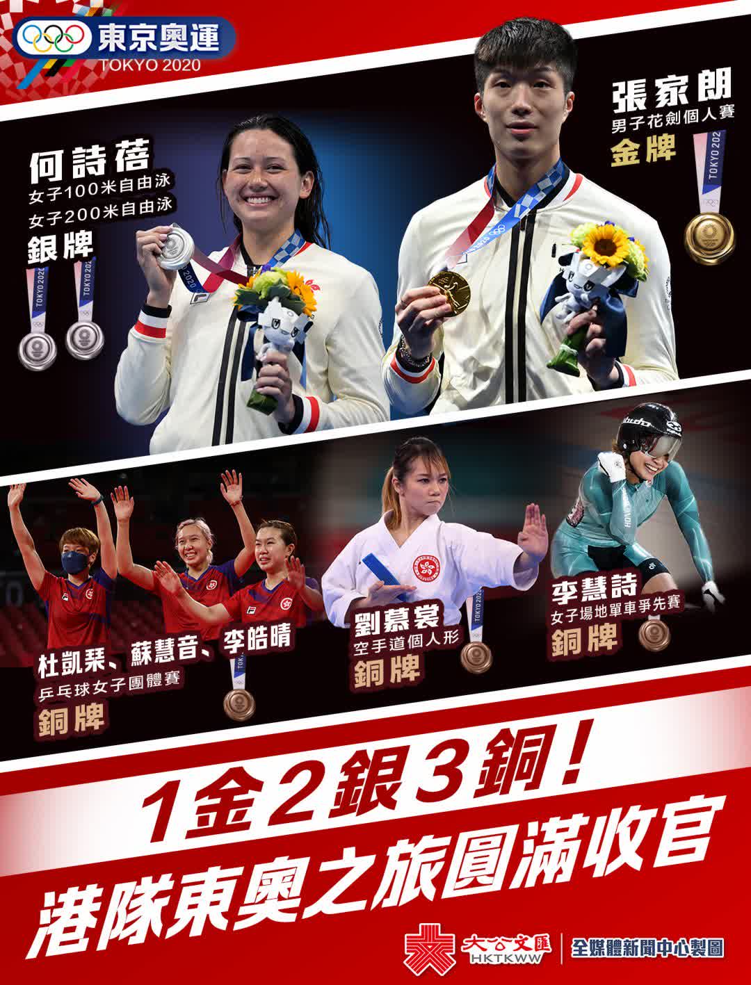 其中張家朗在男子個人花劍項目為香港奪得金牌,這是自1996年亞特蘭大奧運會李麗珊代表香港取得首面奧運金牌後,相隔25年後香港代表隊在奧運賽事中奪得第二面金牌,更是首面以「中國香港」名義取得的奧運金牌,使香港特別行政區區旗首次於奧運頒獎典禮上升至最高位置。