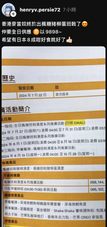 而近日網傳香港麥當勞內部通知,指本港麥當勞將推出楓糖班戟漢堡系列產品,包括豬柳蛋堡及豬柳堡兩款,預計7月27日開始第一階段的推廣,8月1日起則進行第二階段,而8月19日則推出早餐餐牌的推廣活動。據悉7月27日開始銷售,售賣期或長達3個月,去到10月底左右,全日24小時供應。麥當勞回覆傳媒查詢時表示,暫時未有相關消息發布,如有公司會出新聞稿公布。
