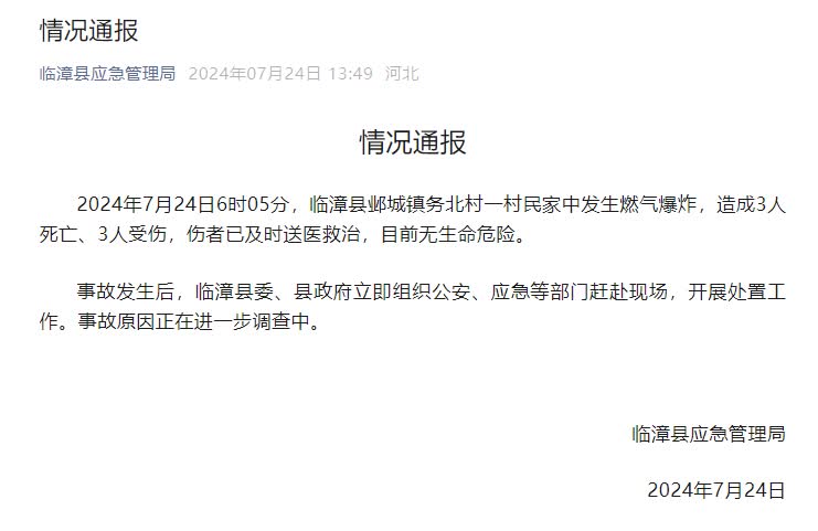 據央廣網報道,7月24日6時05分,河北省邯鄲市臨漳縣鄴城鎮務北村一村民家中發生燃氣爆炸,造成3人死亡、3人受傷,傷者已及時送醫救治,目前無生命危險。