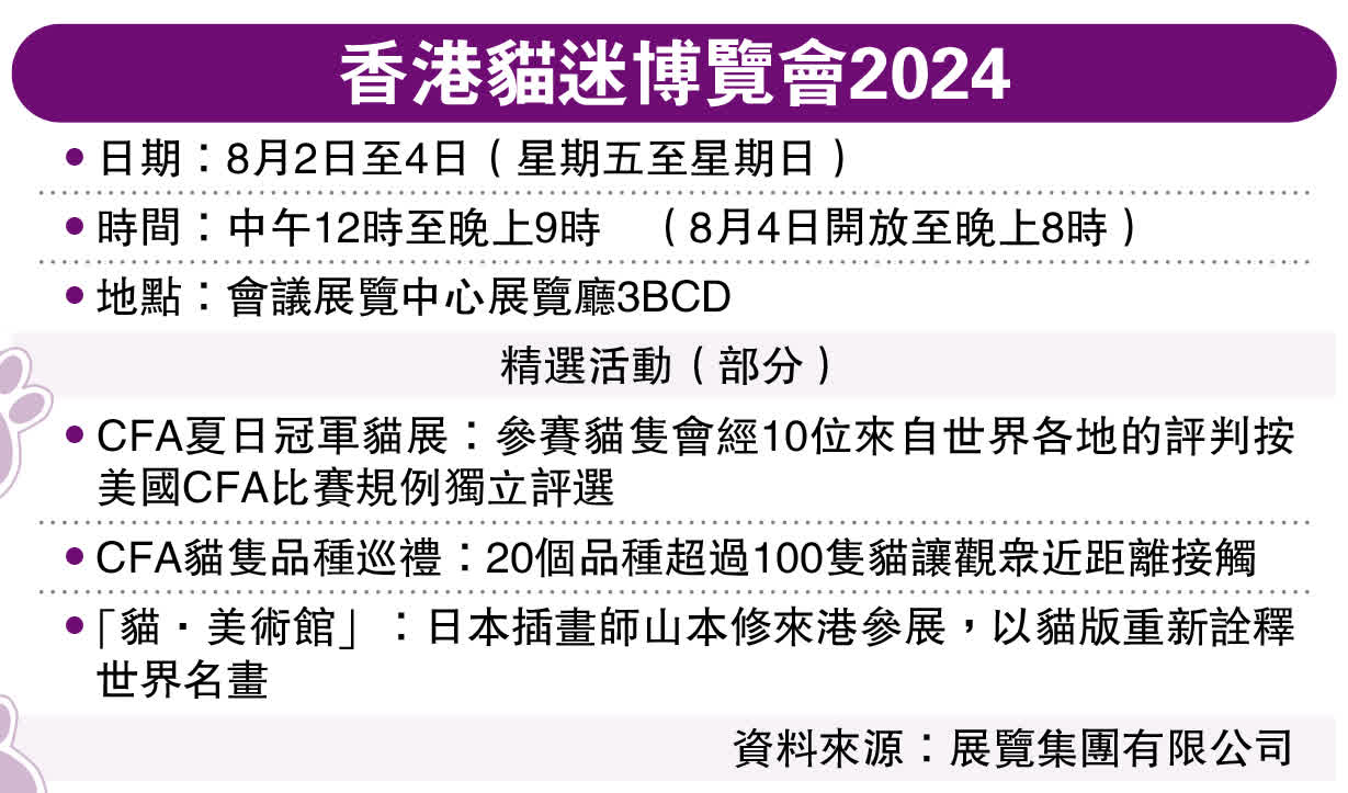 第二屆貓迷博覽將於8月2日起,一連三日在灣仔會展中心舉辦,共200個展商、410展位參與。除了寵物用品和文創產品,今年設有CFA國際貓展、「CFA貓隻品種巡禮」等活動,觀眾可近距離接觸20個品種超過100隻貓,場內並提供貓咪知識講座。朱雪玲表示,希望吸引貓迷留港消費,期望入場人次維持於去年18萬人次的水平。