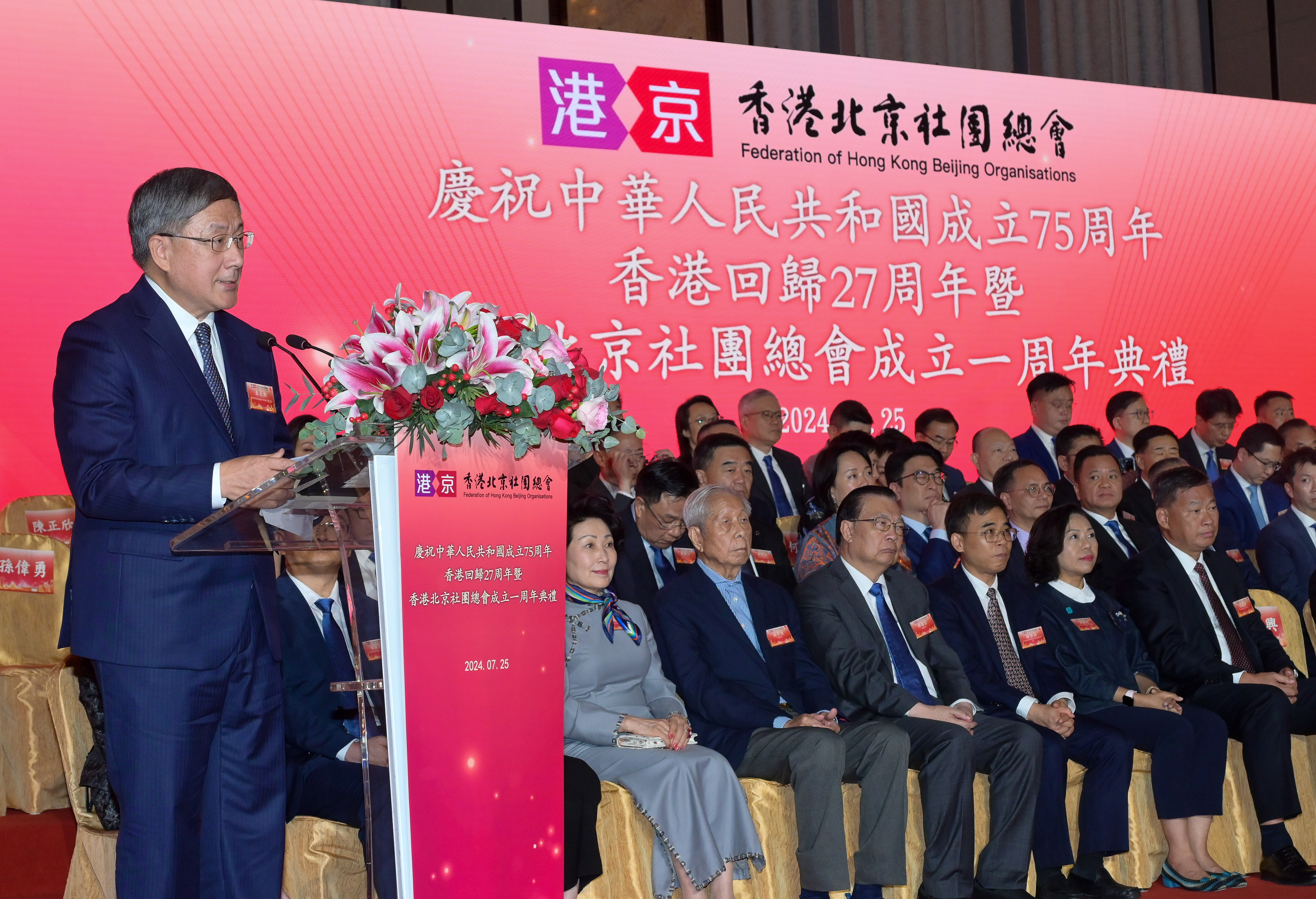 他續指,今年10月,將迎來新中國成立75周年的大日子。當前,國家成功創造無數的發展奇蹟,國力和人民的幸福感達到前所未見的高度。為進一步推進中國式現代化,要加快發展「新質生產力」,全力為國家與香港增強高質量發展的動能,並堅持以人民為中心,時刻以增強市民的獲得感、幸福感為目標。他相信北京社團總會定能繼續發揮聯通京港的作用,為兩地的企業與人才拓展新的合作空間,為實現中華民族偉大復興貢獻力量。