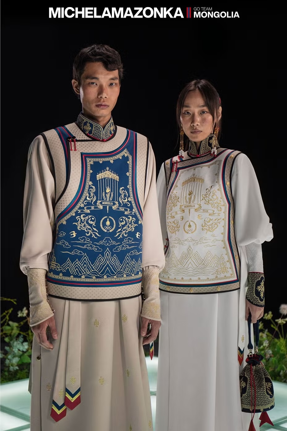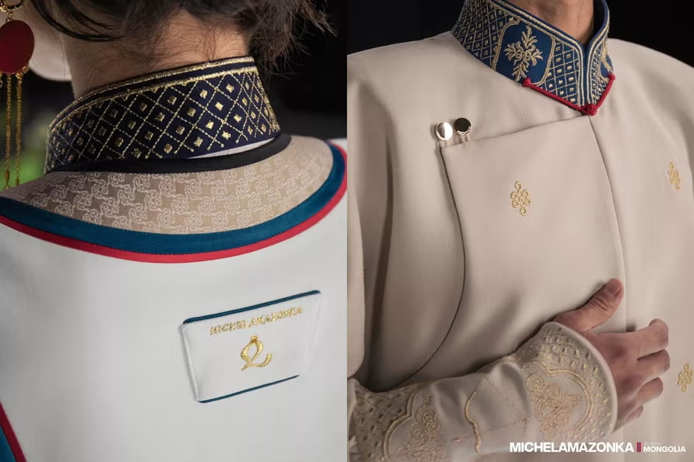 ✅蒙古隊服裝由烏蘭巴托本地品牌Michel&Amazonka設計,靈感來源於大草原上便於鞍馬的傳統服飾「德勒」,服裝上繡有與蒙古相關的元素。