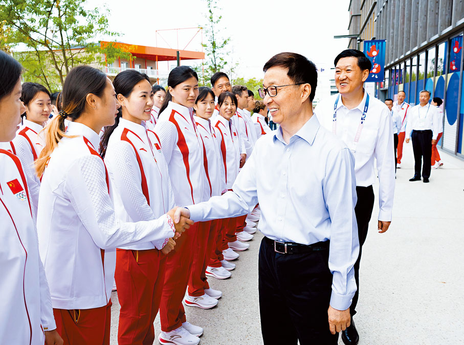 運動員、教練員、工作人員們紛紛表示,感謝習近平總書記和黨中央的親切關懷,感謝韓正副主席前來看望,大家倍感溫暖、倍感振奮,將胸懷偉大祖國,不忘光榮使命,不負人民期待,為巴黎奧運會精彩成功貢獻中國體育的力量和風采。