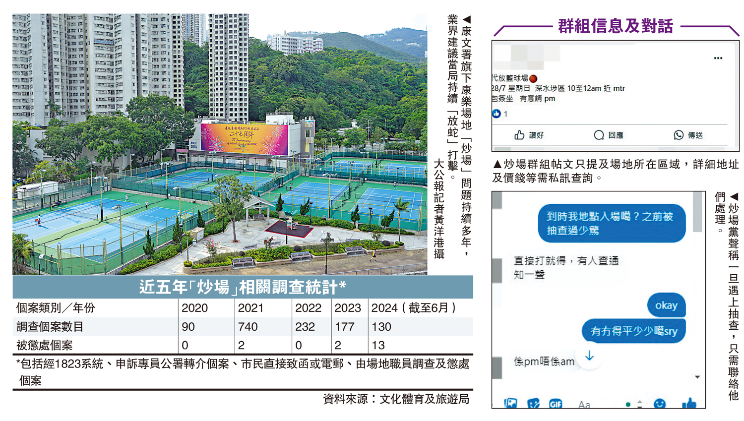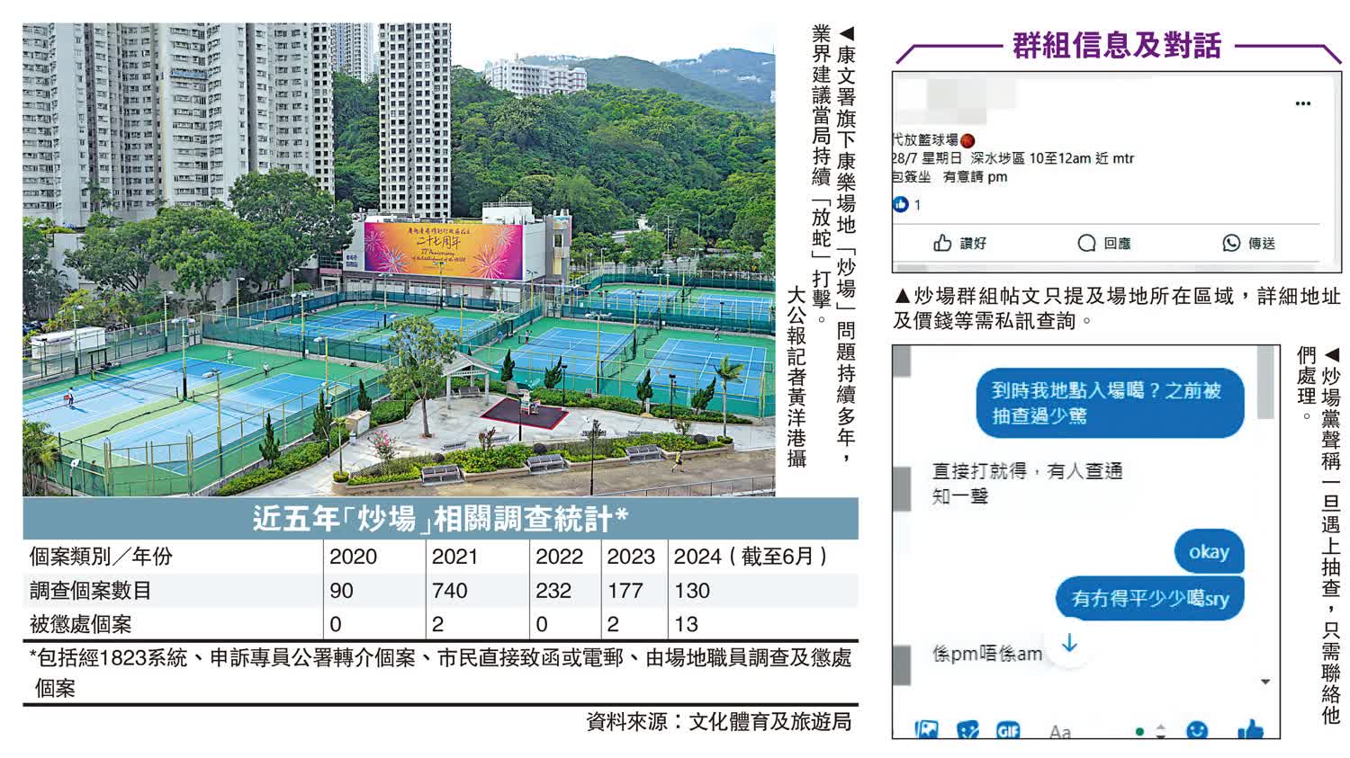 康文署表示,本月13日聯同入境處及警方,在灣仔區的網球場打擊「炒場」活動。在維園網球場的聯合行動中,三人涉嫌參與「炒場」被捕,其中一名外傭涉嫌轉售租訂的網球場地以賺取報酬,違反逗留條件。入境處亦拘捕一人,涉嫌在無合理辯解下使用及管有他人身份證。入境處正跟進調查被捕人涉及的入境罪行,不排除有其他涉案人被捕。