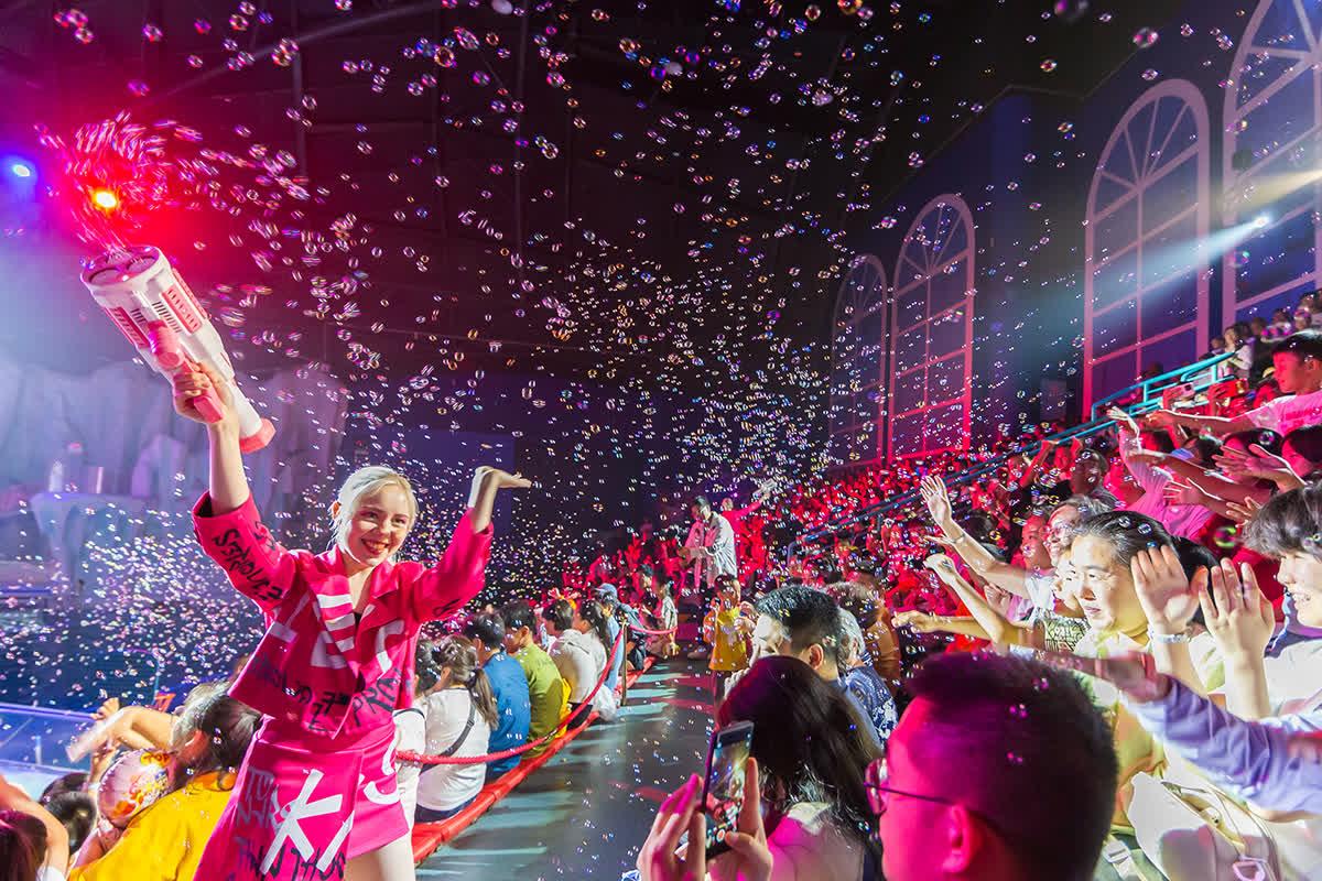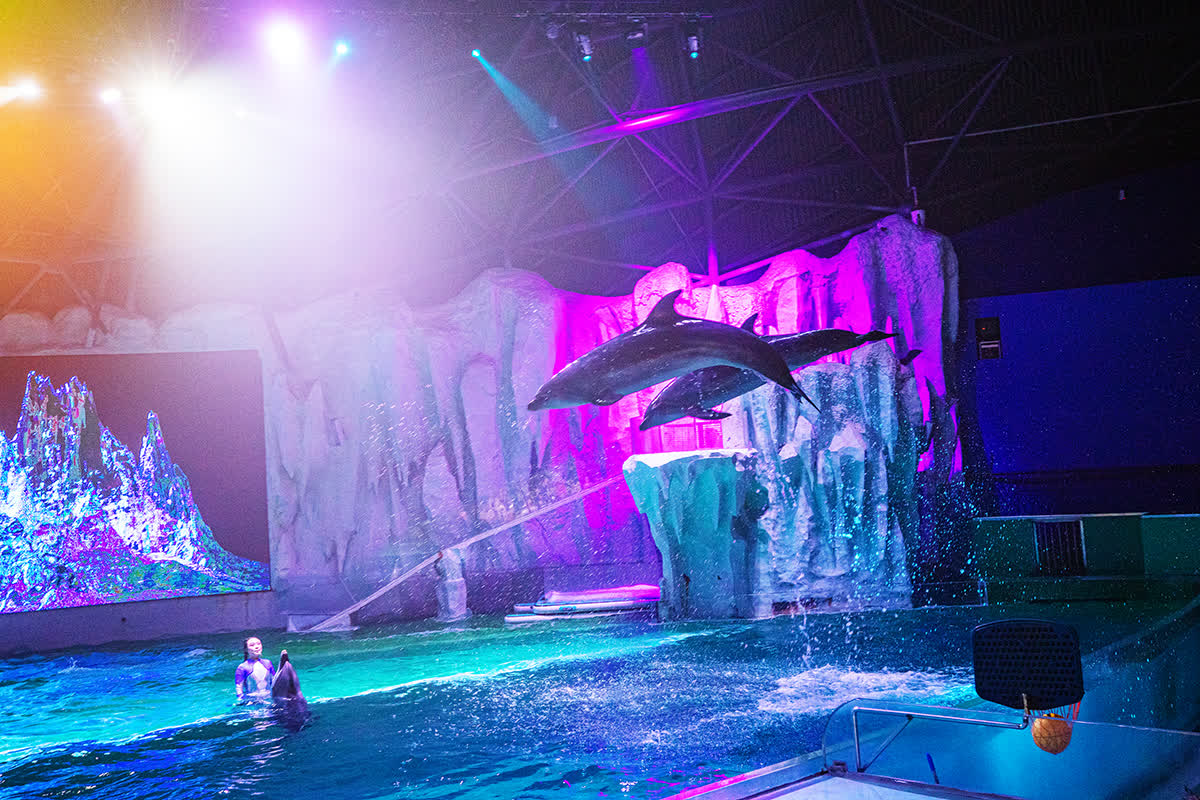 為了打造這場前所未有的海豚秀,哈爾濱極地公園引入行業首個全息紗幕投影技術,將影像與實景表演結合;打造AI數字淘學企鵝形象,為觀眾帶來了更加生動、有趣的互動體驗。整場大秀讓遊客彷彿置身一個夢幻空間。海豚的每一次跳躍、高空表演藝術家的每一次翻轉,都伴隨着璀璨奪目的光影變化,營造出超越現實的震撼效果。