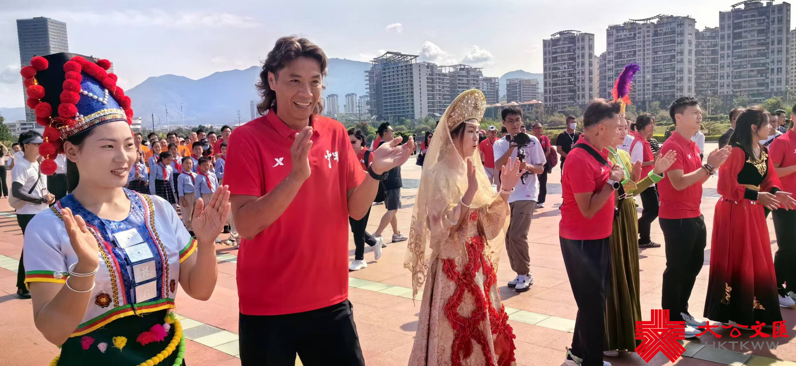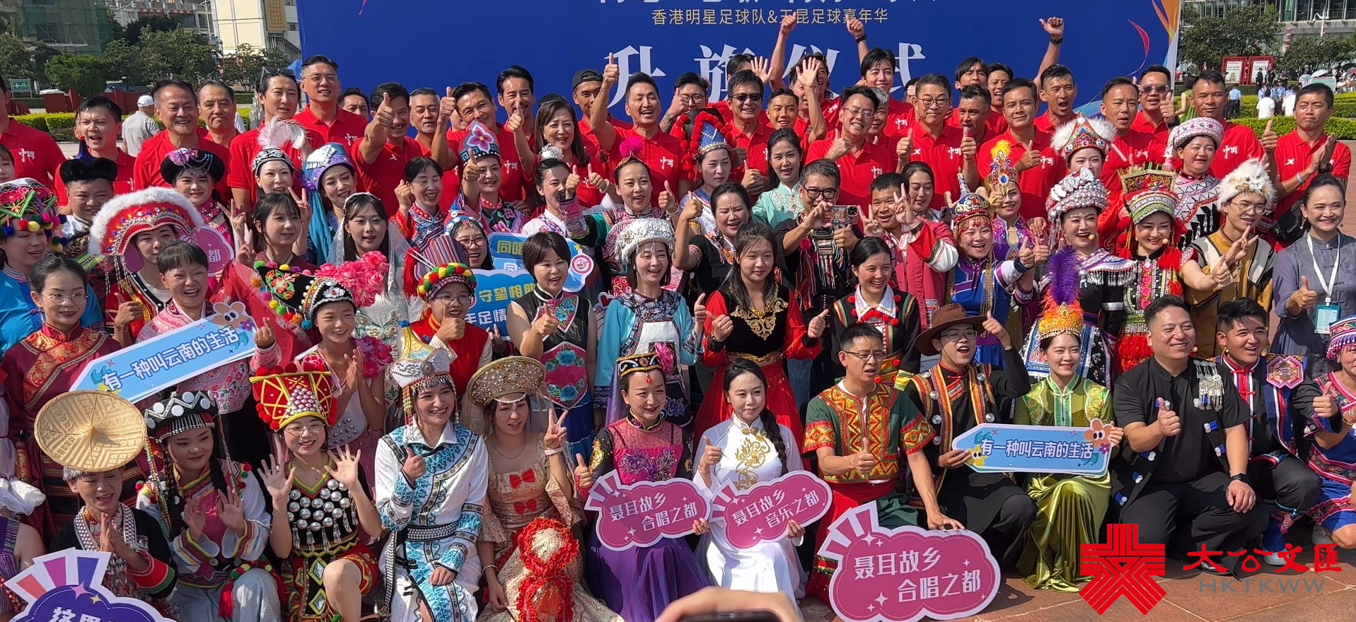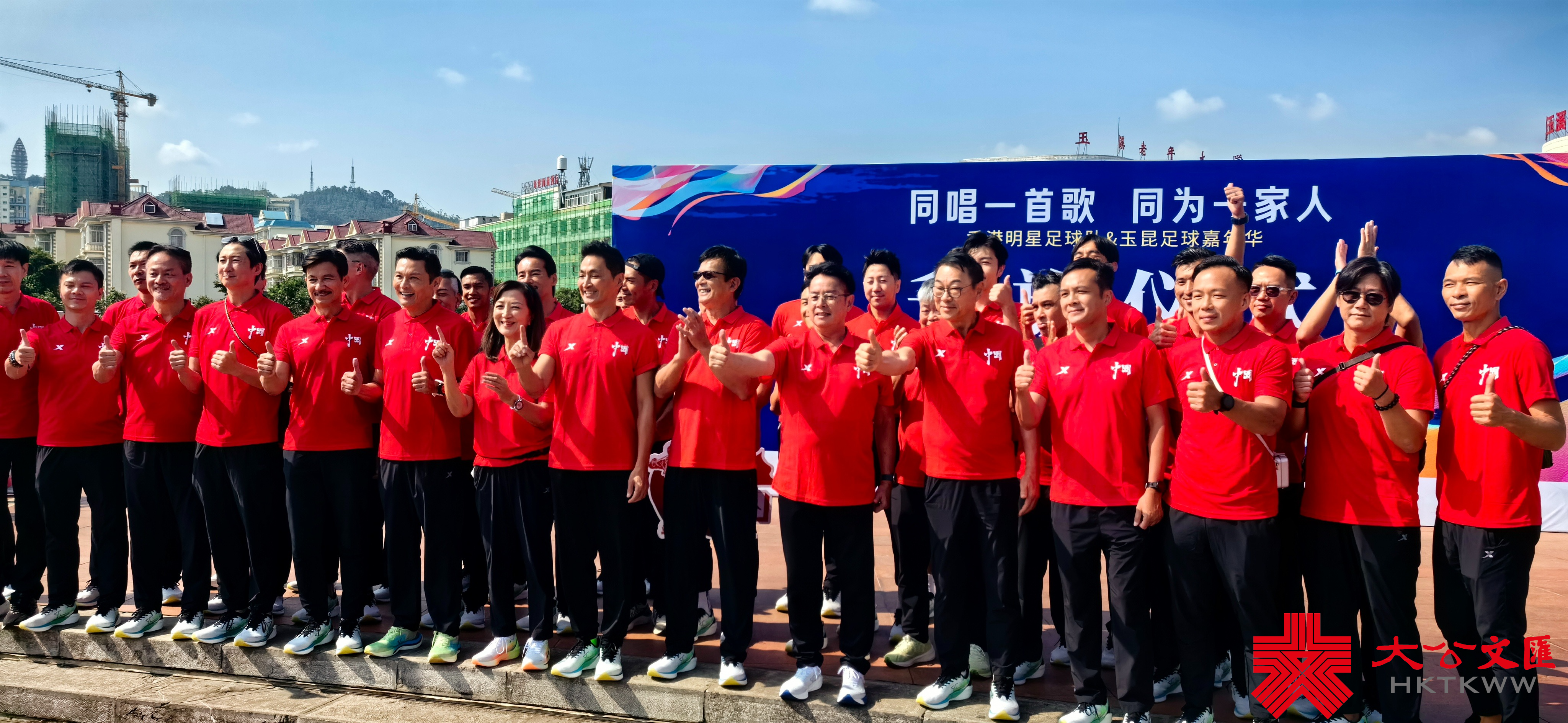 當五星紅旗高高升起,香港明星隊員們情不自禁在《愛我中華》的歌舞聲,與身着56個民族服飾的群眾在國旗下圍成一圈,與大家共同快樂打跳,並高興地與手舉「守望相助,手足情深」「共同團結奮鬥,共同繁榮發展」「同唱一首歌,同為一家人」「鑄牢中華民族共同體意識」字牌的球迷歌迷合影。是時玉溪室外溫度接近30度,而快樂融洽的氣氛十分高漲,感染了每一個在場的人。
