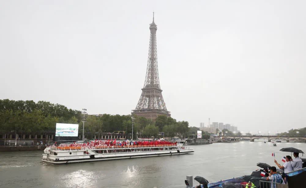 這是現代奧運會首次在開放式城市空間舉行開幕式。整個開幕式以城市做背景、河流為跑道、碼頭當坐席,205個代表團約6800名運動員搭乘85艘船隻,從奧斯特裏茨橋出發,向西航行約6公里,途經巴黎聖母院、盧浮宮、協和廣場等標誌性建築,至埃菲爾鐵塔對岸的特羅卡德羅廣場參加慶祝儀式。河流、建築、橋樑構成了天然舞台,體育、歷史、藝術在塞納河完美融合。