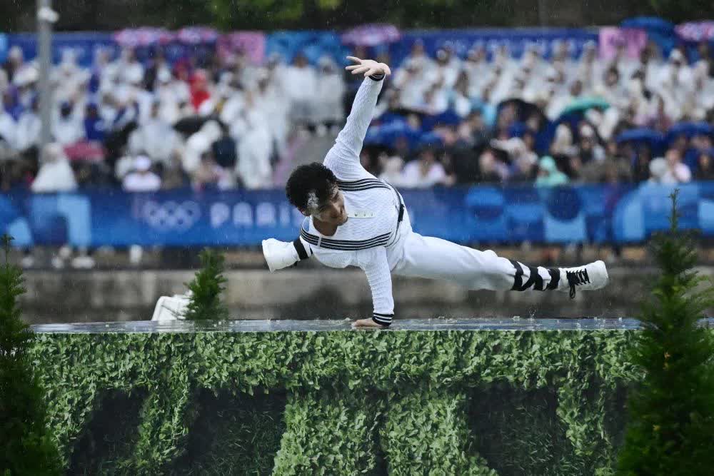塞納河中央出現了5個浮動舞台,它們由90個重量在1噸到5噸間的壓載物和系泊線固定。這些舞台上出現了奧運會新增的4個體育項目,即兼具表演性、觀眾緣、包容性的霹靂舞、攀岩、滑板和衝浪。這些運動很年輕,在街道或大自然中時常可見。大雨中,一位霹靂舞演員兼歌劇演唱家不僅表演了霹靂舞,還演唱了歌劇《殷勤的印第安人》中的選段。