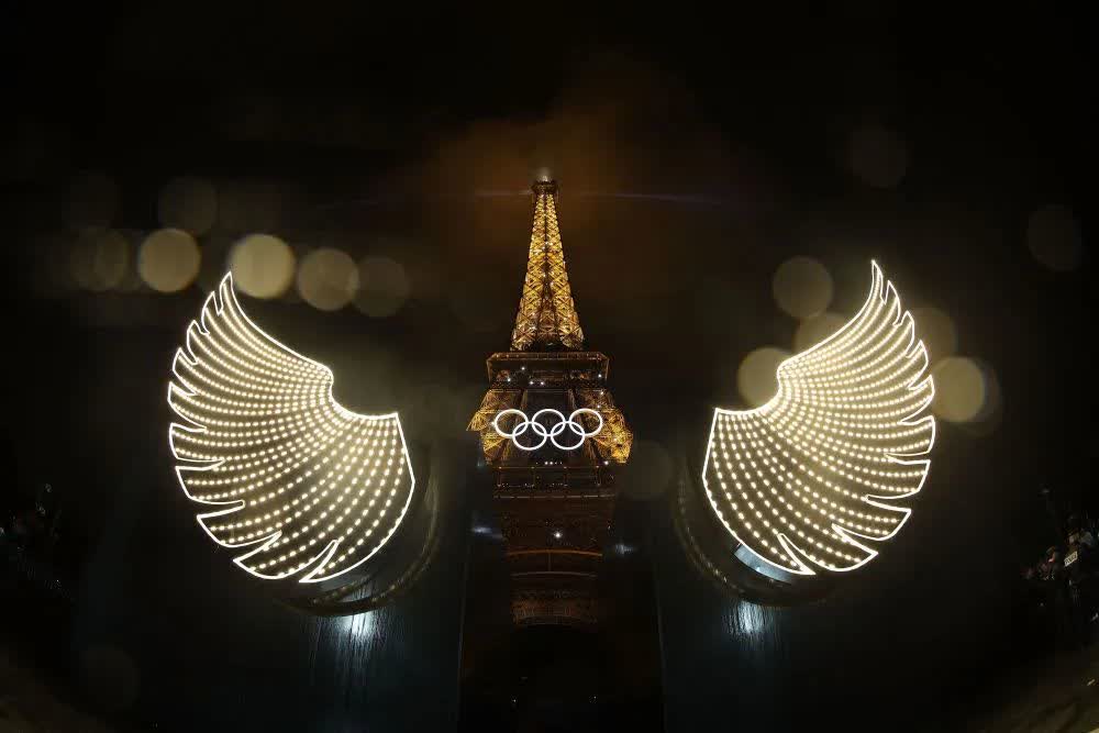 塞納河上,身披奧運五環鬥篷的女騎士騎金屬馬踏水而來。她穿過耶拿橋,到達特羅卡德羅廣場,邀請全世界一起捍衛卓越、尊重、友誼的奧林匹克價值觀。她經過時,橋樑上的燈光形成了和平鴿的翅膀。各代表團的旗幟在特羅卡德羅廣場和埃菲爾鐵塔之間行進,鐵塔下亦出現一對巨大翅膀,女騎手和白馬從水中登陸鐵塔下。