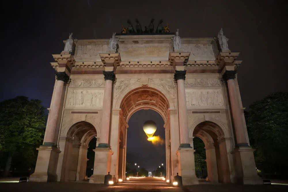 主火炬頂部是一個高30米、直徑22米的熱氣球。241年前,人類首次氫氣球飛行在這裏開啟。經過最後幾棒傳遞,法國柔道奧運會冠軍特迪·裏內和法國田徑奧運會冠軍瑪麗-若澤·佩雷克走向火炬塔,點燃火焰環,熱氣球緩緩騰空,火炬點亮整座城市。與病魔作鬥爭的著名歌手席琳迪翁在埃菲爾鐵塔下縱情高歌,充滿力量的歌聲響徹全場。