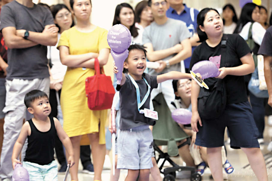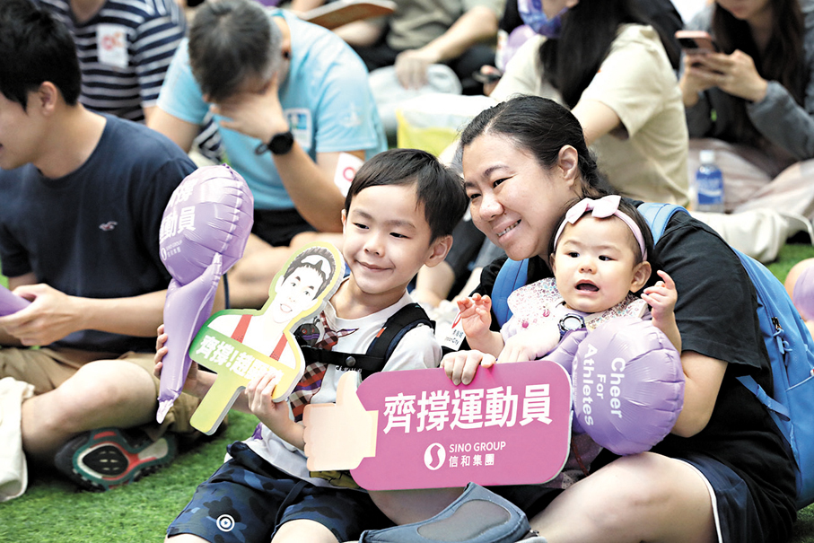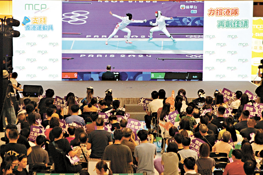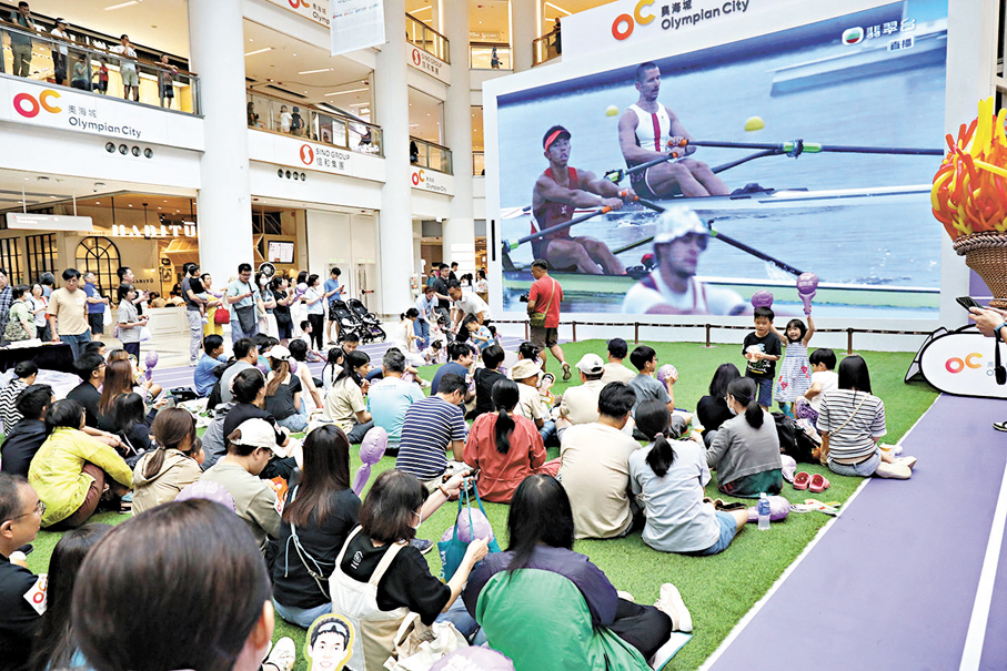 (香港文匯報記者 張弦、郭倩、劉明)巴黎奧運香港時間昨日舉行首日賽事,香港隊多名運動員出戰賽艇、柔道、劍擊、游泳等項目的賽事,全港各區多個商場直播賽事。其中,大角咀奧海城昨日下午舉辦「齊撐港隊賽事直擊派對」,吸引數百名巿民透過430吋大電視觀看賽事直播。現場所見,不少市民一家大小一齊拿起加油棒、打氣道具為港隊運動員歡呼吶喊助威。將軍澳MCP新都城中心亦舉行「齊撐港隊直播狂歡派對」,數百名市民在現場直擊江旻憓、趙顯臻及女子游泳代表隊等港將出戰情況。有坐輪椅的市民認為在家中觀看賽事沒有氣氛,提前報名在商場大熒幕觀賽,期望香港代表可得到金牌。有家長帶同子女看比賽,希望讓他們見識奧運和體育精神。