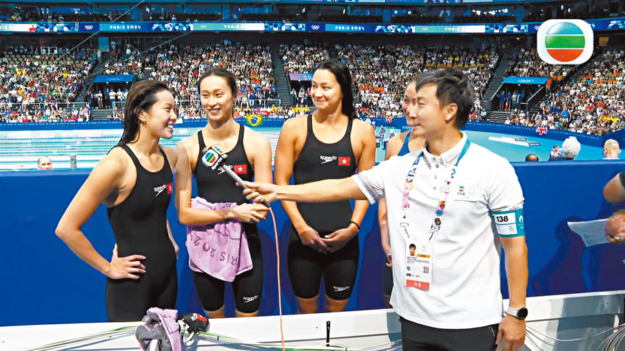 (香港文匯報記者 梁靜儀)TVB奧運特派專員兼有「飛魚王子」之稱的方力申(小方)在採訪游泳比賽方面,成功邀請了四位參加4×100米自由泳接力的港隊運動員歐鎧淳、譚凱琳、鄭莉梅及簡綽桐進行訪問,四人異口同聲表示現場氣氛相當好。