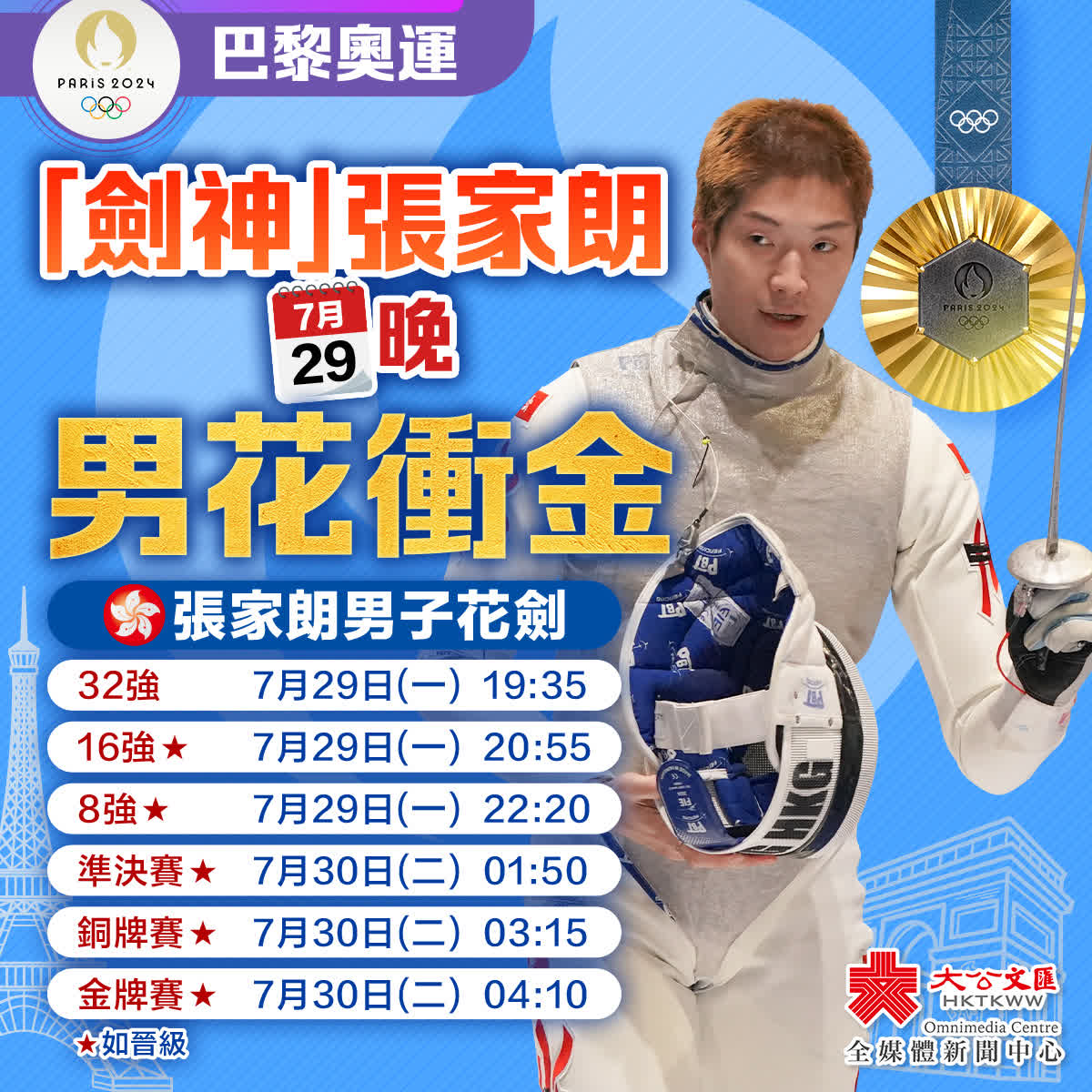 大公文匯全媒體報道,江旻憓勇奪港隊奧運首金之後,今晚(29日)輪到「劍神」張家朗寶劍出鞘,爭取衛冕男子花劍個人賽金牌。張家朗本港時間今晚7點35分出戰32強賽,一路順利晉級的話,將在晚上9點25分參加16強賽,晚上10點20分出戰8強賽,明日(30日)凌晨1點50分出戰4強賽,最終在4點10分爭奪金牌。