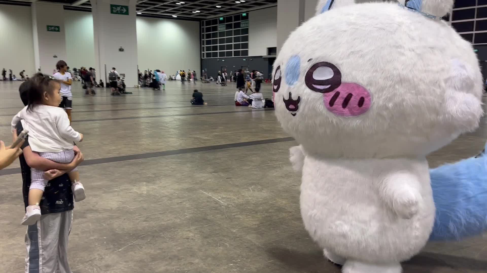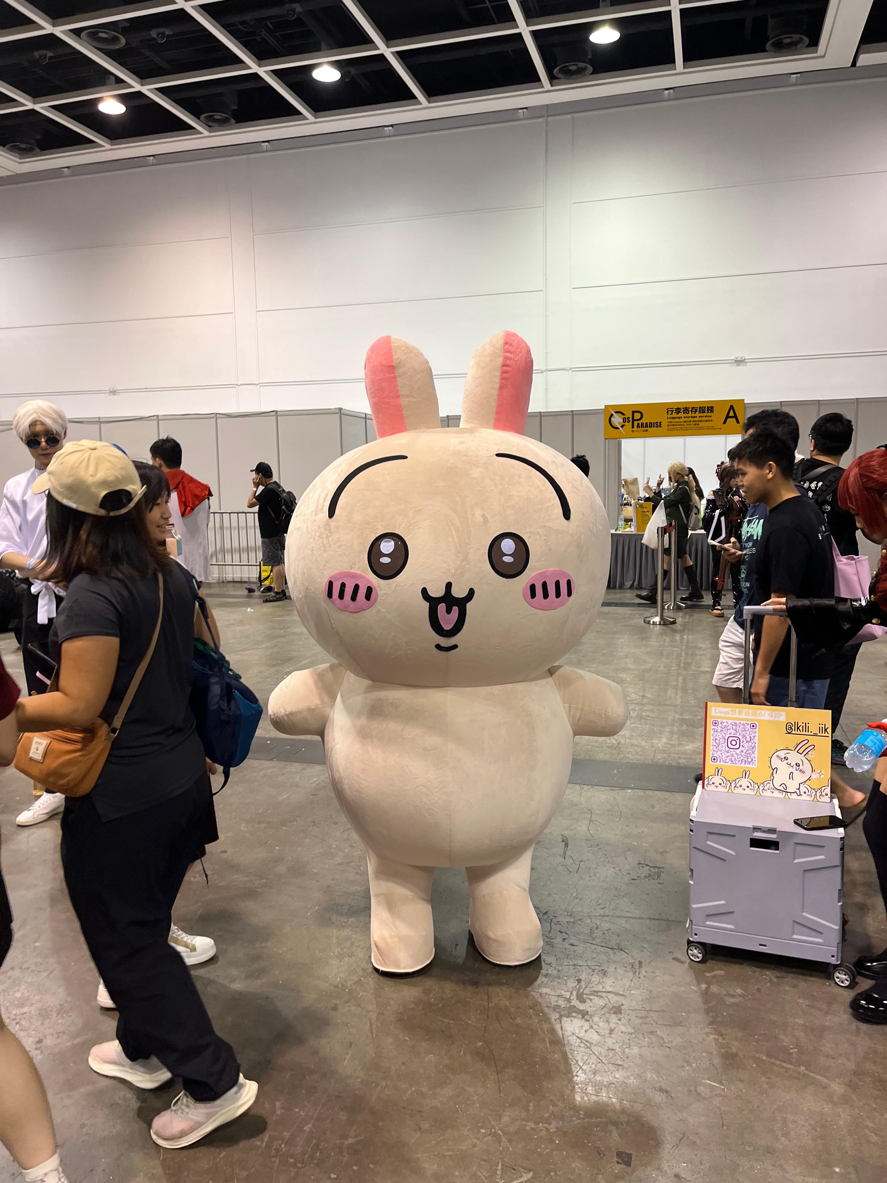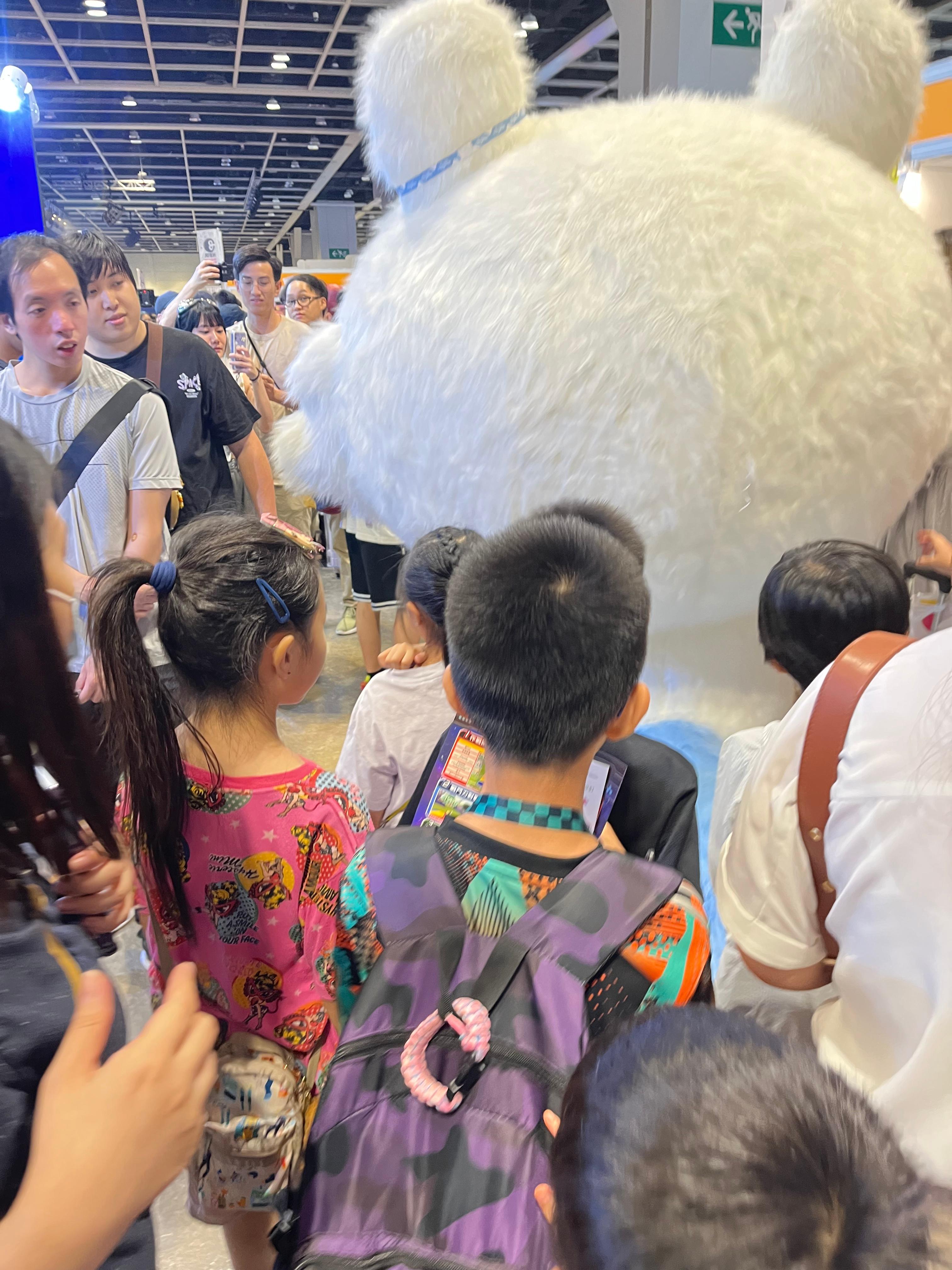 不過要說最吸睛的,還要數Chiikawa。今日有吹氣卡通皮套的飛鼠及Usagi在場,大家都排隊合照,好開心。其中飛鼠的Coser相當活躍,主動與小朋友打招呼,又全場走動,被大批小朋友「尾隨」。Usagi則蹦蹦跳跳,完全符合原作。