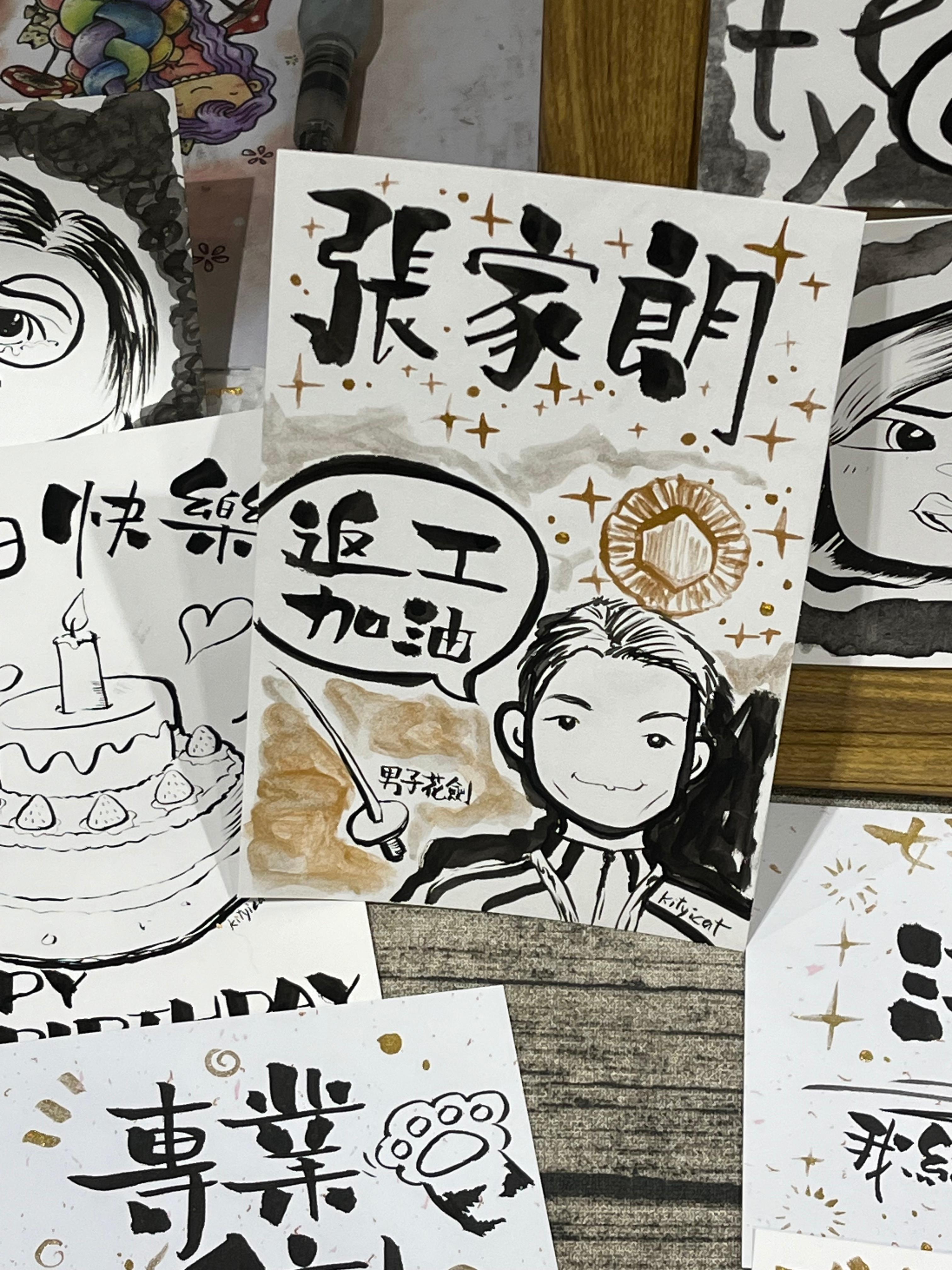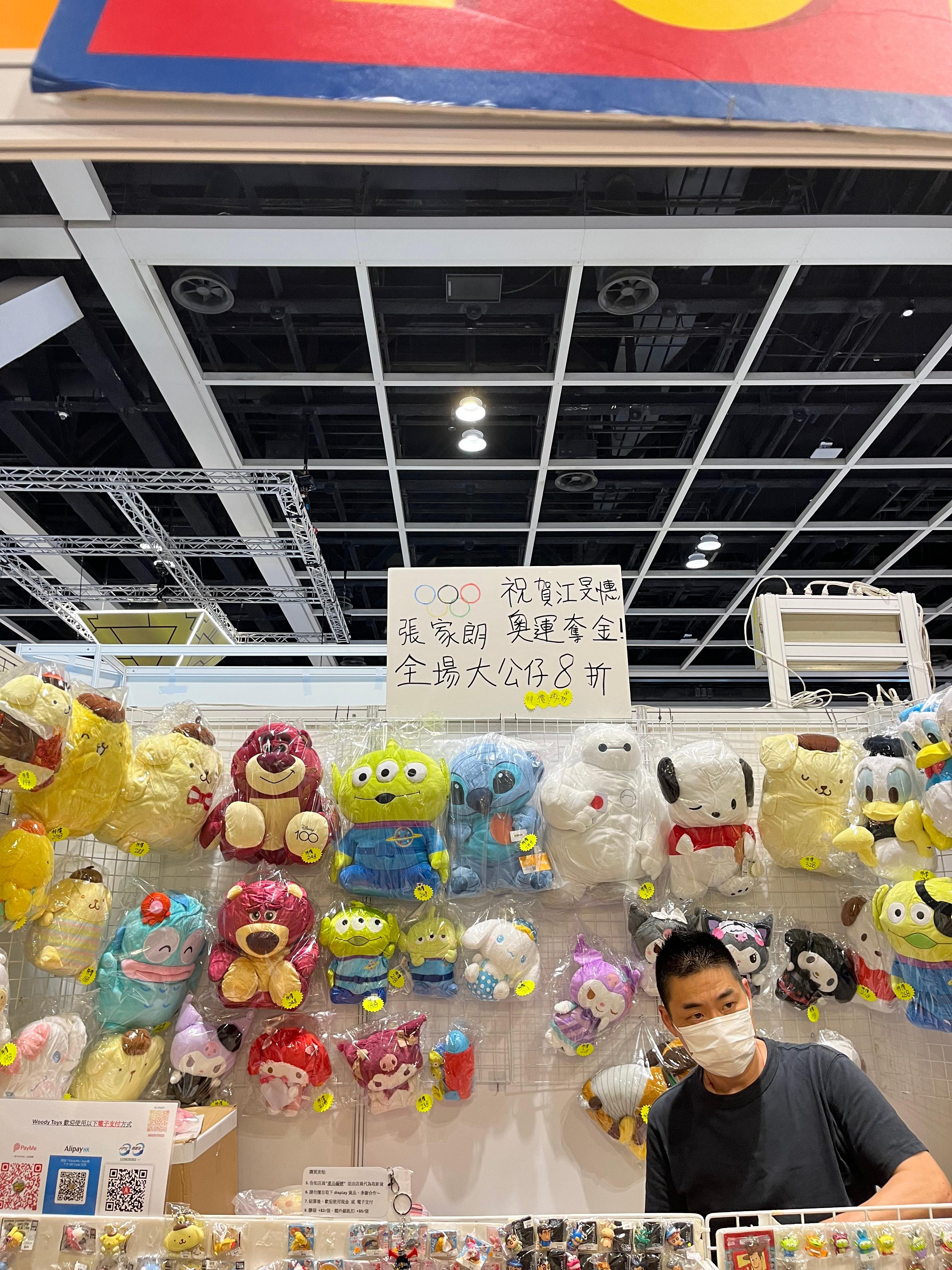 在其中一個攤位,就貼上告示「祝賀江旻憓、張家朗奧運奪冠,全場大公仔八折」。另一個即場繪寫的攤位上,就擺有「張家朗男子花劍返工加油」的卡片,相當有心。