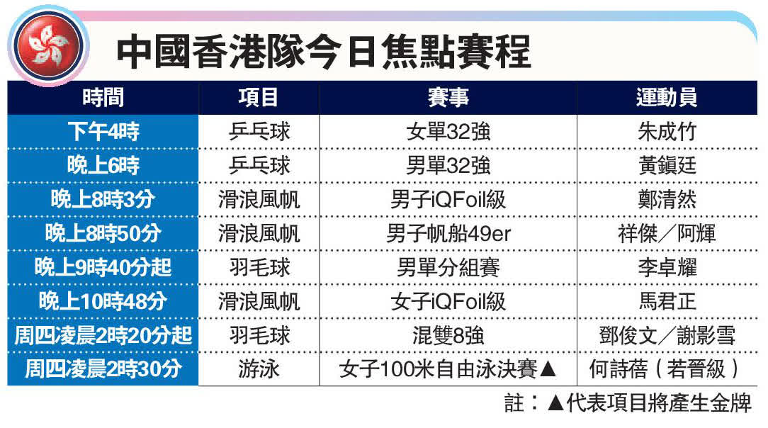 中國香港奧運代表團昨日除了「女飛魚」何詩蓓出戰女子100米自由泳初賽,以及「黃杜配」在乒球混雙獲得第四名外,趙顯臻、何甄陶及楊雅婷/楊霈霖亦有戰線。