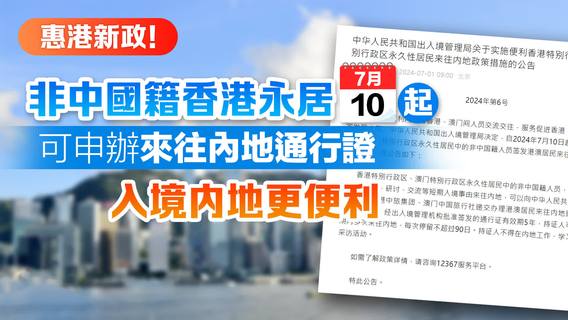 國家出入境管理局此前發布公告,7月10日起為港澳永久性居民中的非中國籍人員簽發港澳居民來往內地通行證(非中國籍)。因投資、探親、旅遊、商務、研討、交流等短期入境事由來往內地,由本人向國家出入境管理局委託的香港中旅集團、澳門中國旅行社遞交申請。