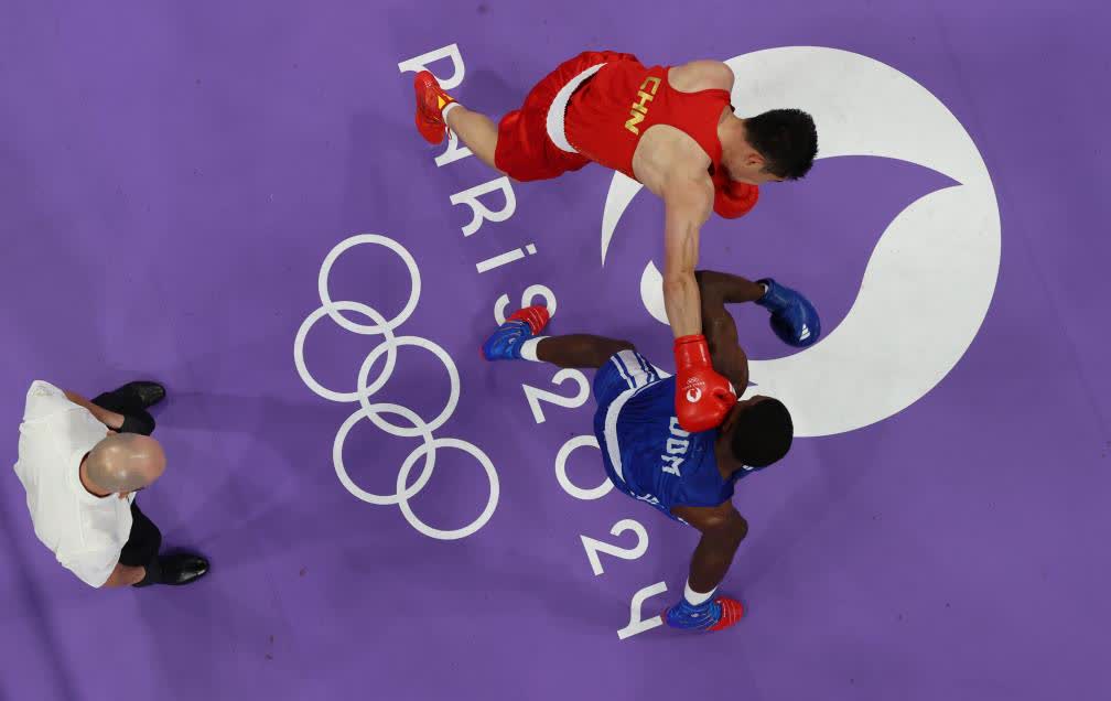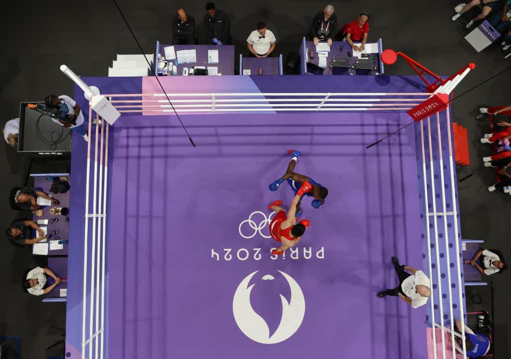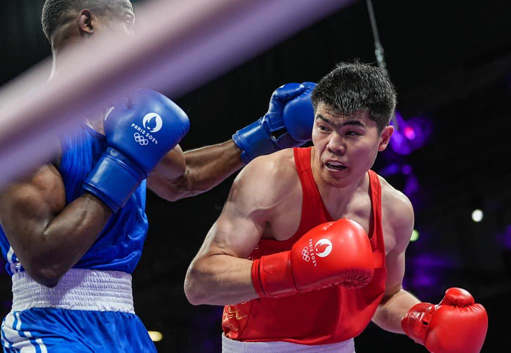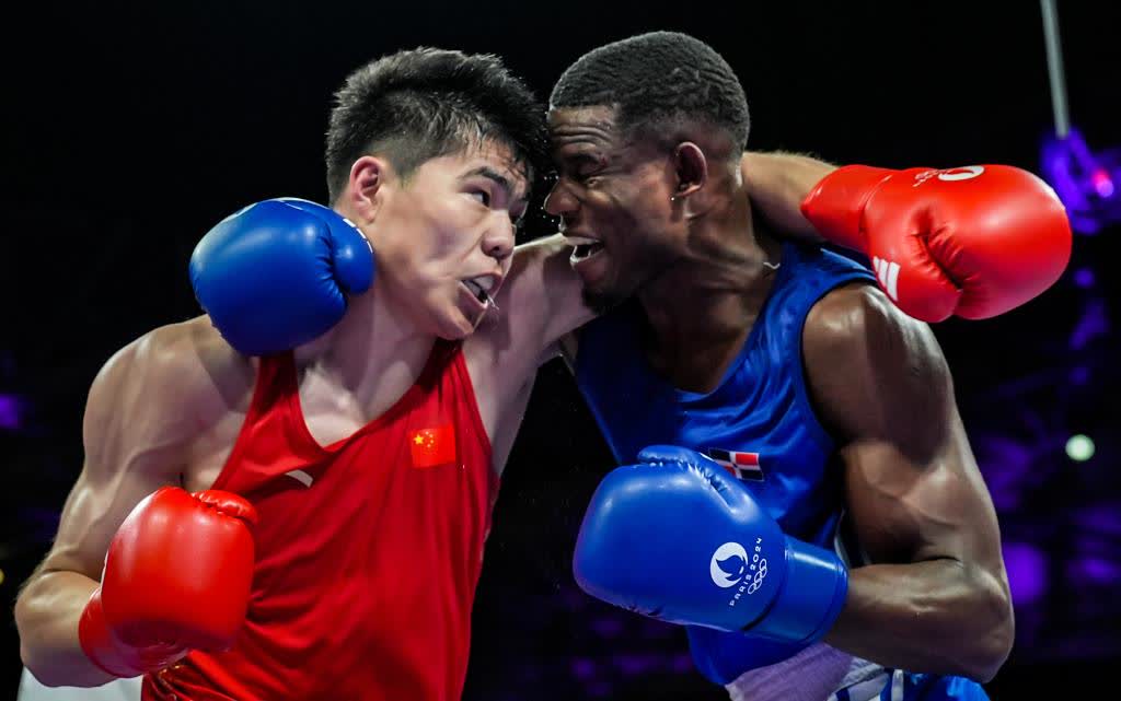 終場鈴聲響起,北巴黎競技場一片寂靜,所有人都等待着一場拳擊比賽的最終結果。聚光燈下,多米尼加運動員皮納萊斯的手被裁判舉起,中國拳手托合塔爾別克·唐拉提汗垂下腦袋,眼神裏流露出疲憊與失落。