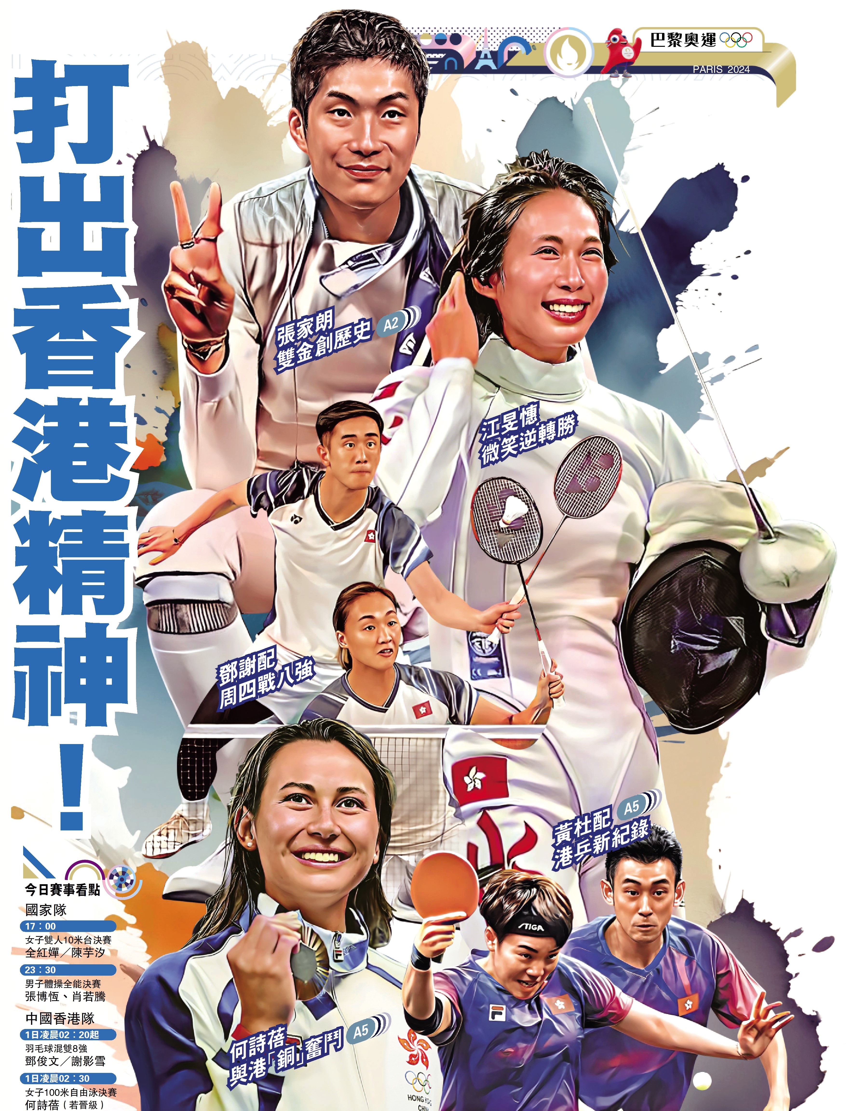 同日,中國香港女飛魚何詩蓓在女子200米自由泳決賽中,以1分54秒55的成績獲得銅牌。中國香港乒乓球混雙組合黃鎮廷/杜凱琹,雖然銅牌戰中不敵對手,仍創下歷屆最佳成績。還有更多已出戰或將出戰的香港運動員,在奧運賽場上展示永不放棄、奮力打拚的鬥志!