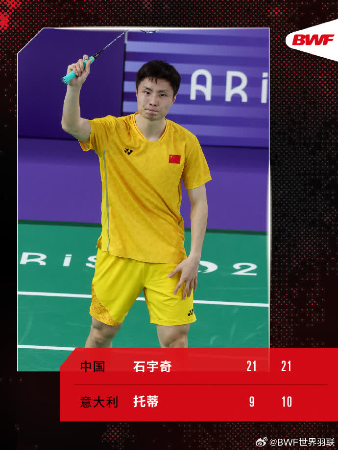 大公文匯網報道,北京時間今天(31日)下午,在巴黎奧運會羽毛球男單小組賽第二輪中,賽會頭號種子、中國選手石宇奇2-0輕取意大利選手托蒂,以小組透明身份成功晉級八強,兩局比分分別為:21:9和21:10。