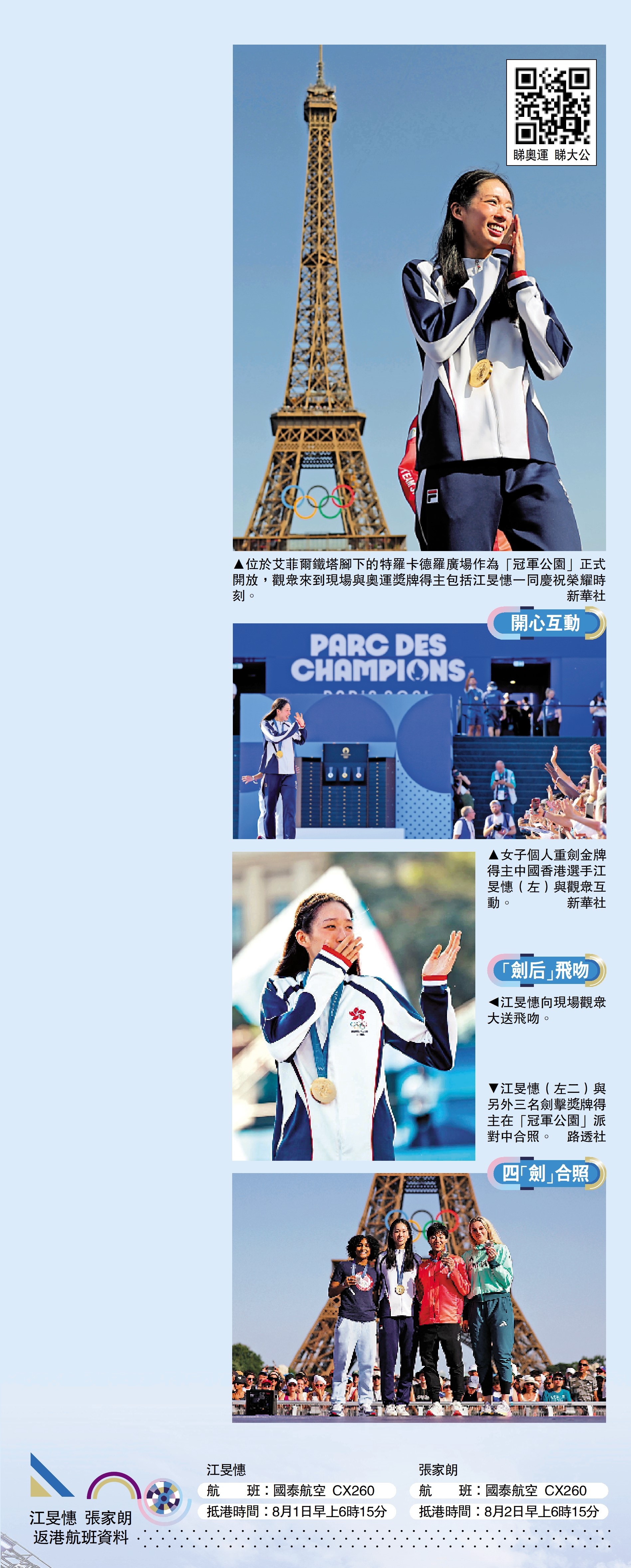 (大公報 特派記者 張銳)「金牌劍后」江旻憓今早從巴黎凱旋。巴黎奧運女子重劍個人賽金牌得主江旻憓啟程返港前,先在周一出席巴黎奧組委向公眾開放、每日舉行的「冠軍公園」派對,心情大好的她在活動中發揮「微笑劍后」本色,不斷向在場觀眾送飛吻,更與另外三名劍擊獲獎運動員一同享受這個勝利舞台,亦有合照留念。江旻憓大讚這個新設的慶祝派對氣氛極佳,足以彌補她未能出席奧運開幕式的遺憾。