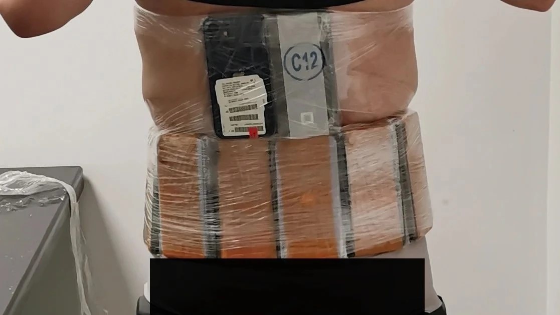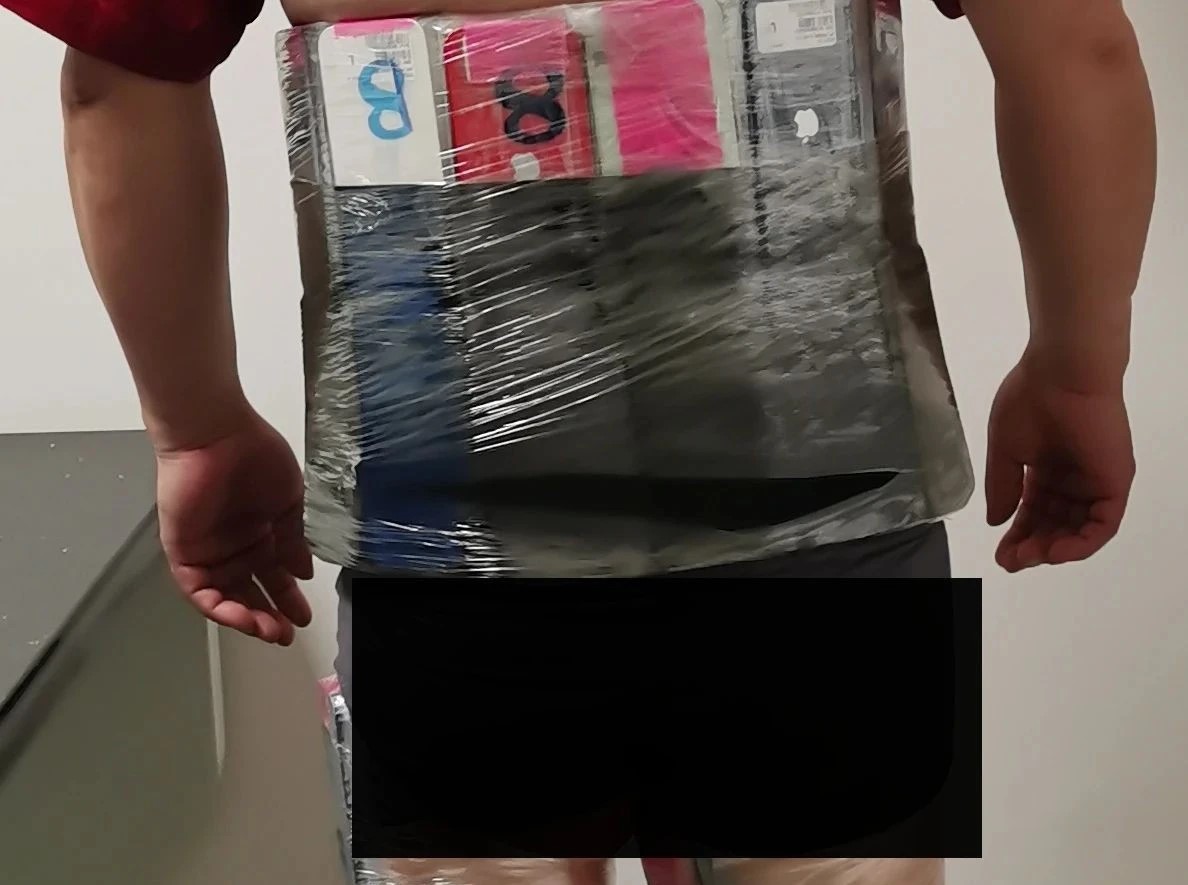 僅過半分鐘後,現場關員發現一名身穿黑色短袖低頭看手機的男子腿部臃腫、走姿異常。隨後又發現另一名身穿墨藍色短袖襯衫的旅客身體僵硬、神情緊張,便對二人進行攔截。經進一步檢查,在其中一名旅客腰腹部、大腿部發現保鮮膜和黑色彈力繃帶捆綁的蘋果牌舊手機50部,另一名旅客腰腹部發現以同樣方式綁藏的蘋果牌舊手機42部。上述三起案件共查獲蘋果牌舊手機138部。