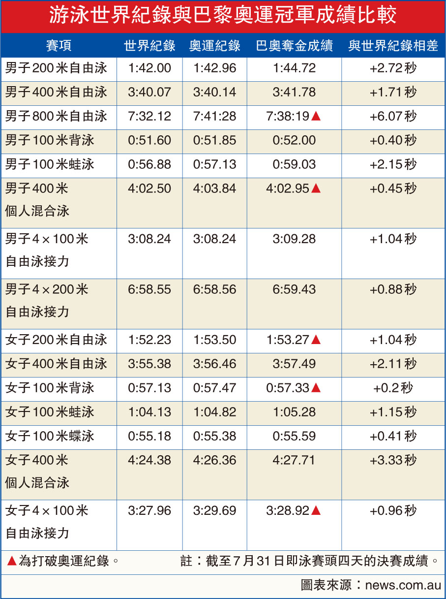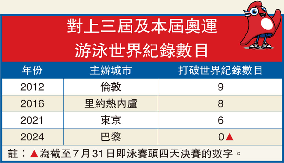 巴黎奧運會游泳賽事合計有九個比賽日,產生35面金牌,當中截至7月31日凌晨結束的決賽誕生了15面,即已經完成了整屆奧運泳賽的接近一半。對比之前三屆的2012年倫敦奧運九個、2016年里約熱內盧的八個以及東京奧運的六個世界紀錄,本屆奧運完成近半卻依然未有新的世界紀錄誕生,有意見認為這可能與泳池水深太淺有關。