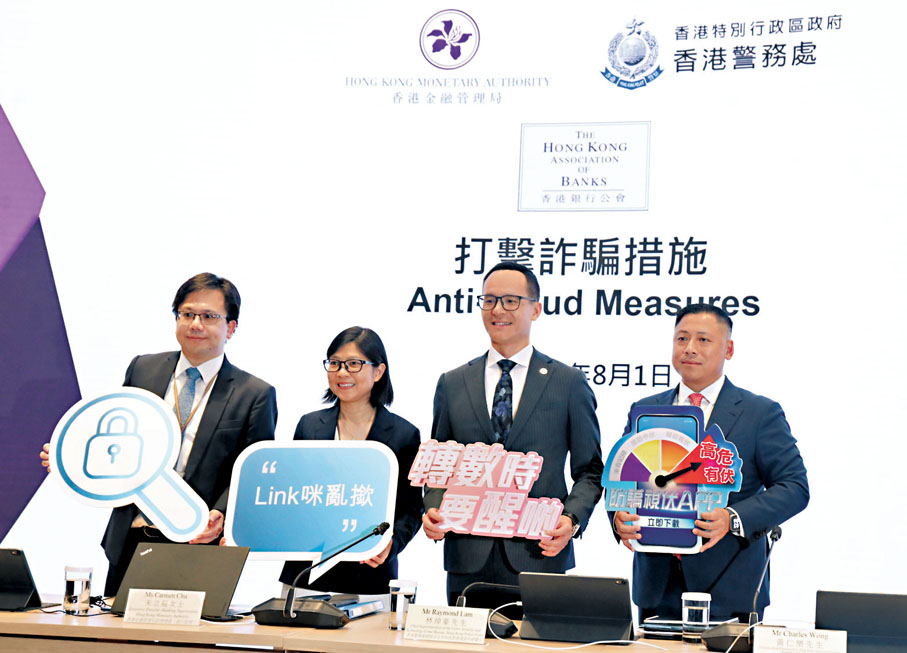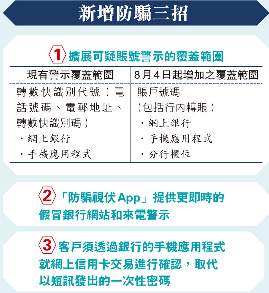 (香港文匯報 記者 曾業俊)騙徒手法層出不窮,香港今年首5個月錄得16,182宗科技罪案,較去年同期升3.5%;涉及損失金額共超過26億元,較去年同期升逾31%。香港金管局聯同警務處及銀行公會昨宣布推出「防騙新三招」,由今年8月4日(周日)起,32間銀行及10間儲值支付工具營運商將擴展「可疑賬號警示」範圍,涵蓋網上銀行及櫃位轉賬;「防騙視伏App」亦會提供更即時的假冒銀行網站和來電警示;此外,客戶將須透過銀行的手機應用程式就網上信用卡交易進行確認,取代以短訊發出的一次性密碼。