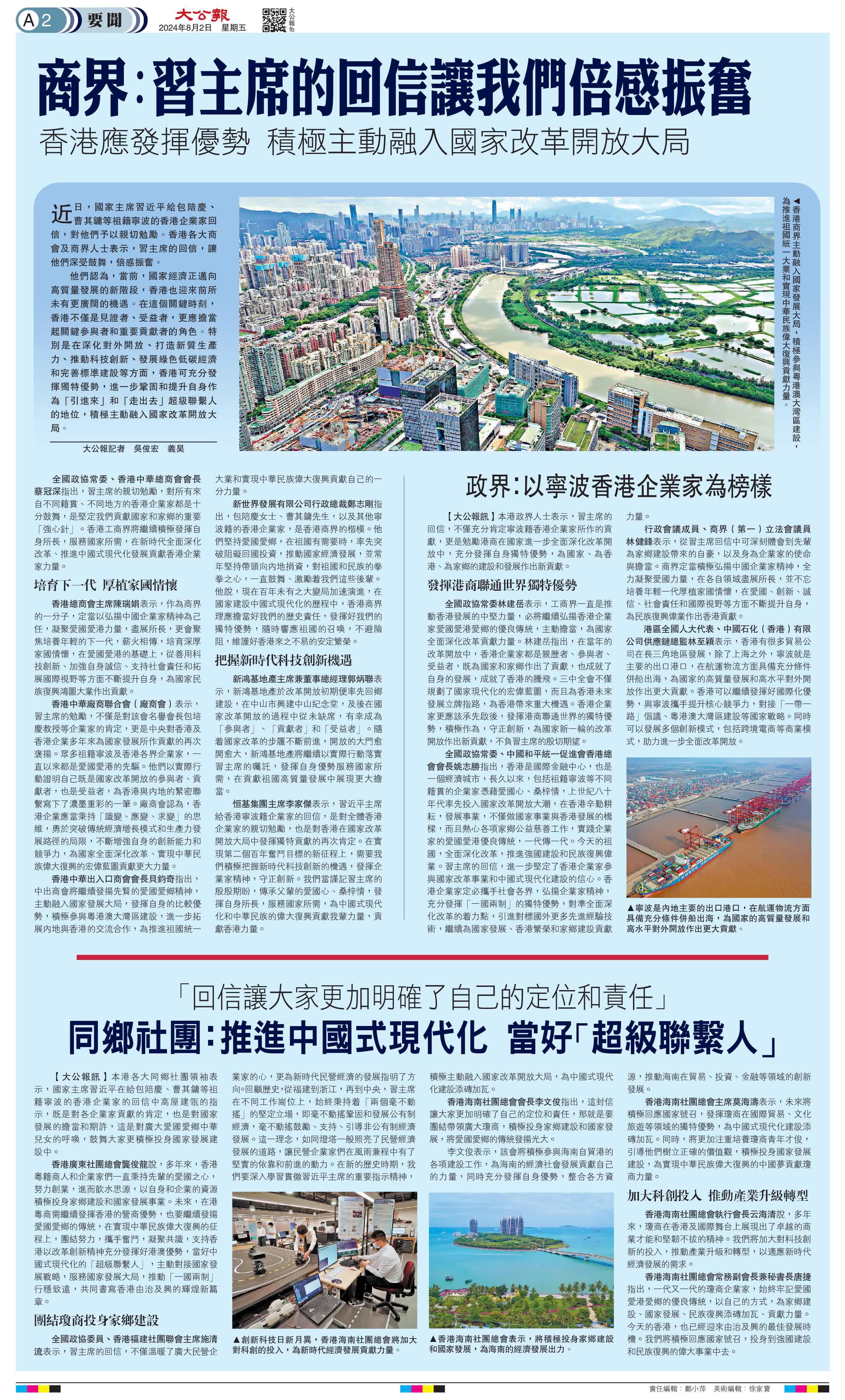 全國政協常委、中國和平統一促進會香港總會會長姚志勝指出,香港是國際金融中心,也是一個經濟城市,長久以來,包括祖籍寧波等不同籍貫的企業家憑藉愛國心、桑梓情,上世紀八十年代率先投入國家改革開放大潮,在香港辛勤耕耘,發展事業,不僅做國家事業與香港發展的橋樑,而且熱心各項家鄉公益慈善工作,實踐企業家的愛國愛港優良傳統,一代傳一代。今天的祖國,全面深化改革,推進強國建設和民族復興偉業。習主席的回信,進一步堅定了香港企業家參與國家改革事業和中國式現代化建設的信心。香港企業家定必攜手社會各界,弘揚企業家精神,充分發揮「一國兩制」的獨特優勢,對準全面深化改革的着力點,引進對標國外更多先進經驗技術,繼續為國家發展、香港繁榮和家鄉建設貢獻力量。