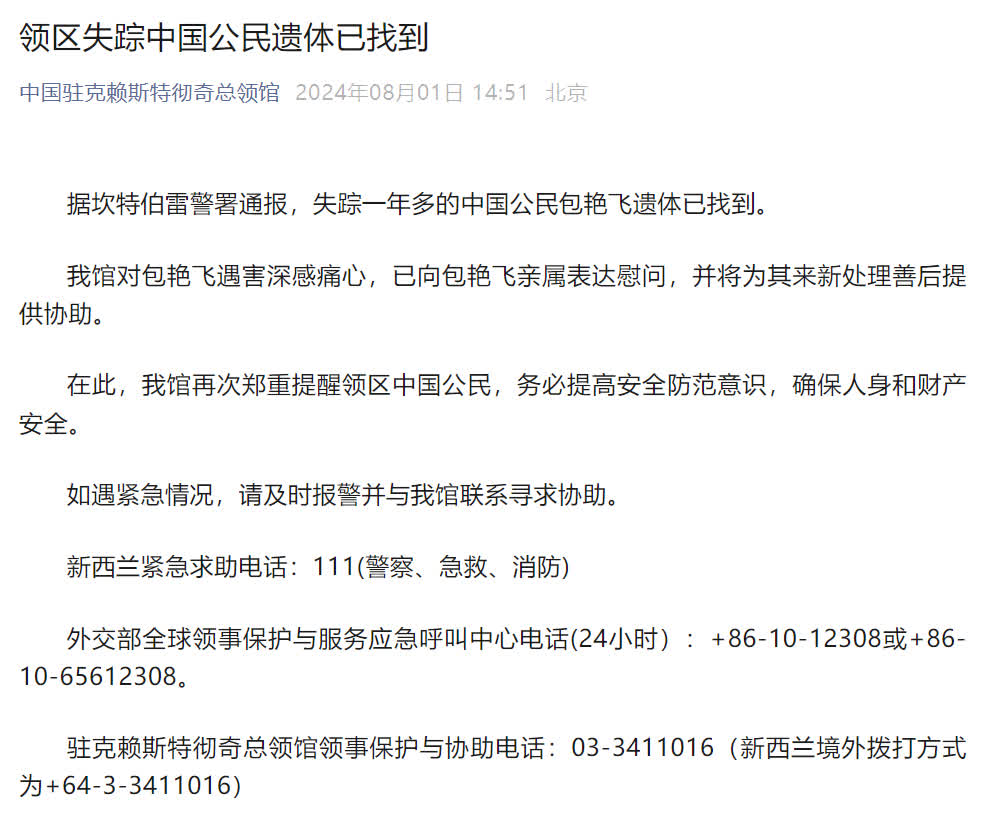 據中國駐新西蘭克賴斯特徹奇總領館8月1日消息,失蹤一年多的中國公民包艷飛遺體已找到。領館表示,對包艷飛遇害深感痛心,已向包艷飛親屬表達慰問,並將為其來新處理善後提供協助。